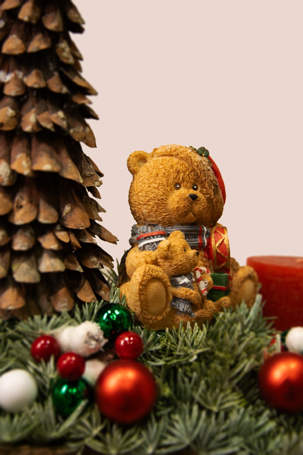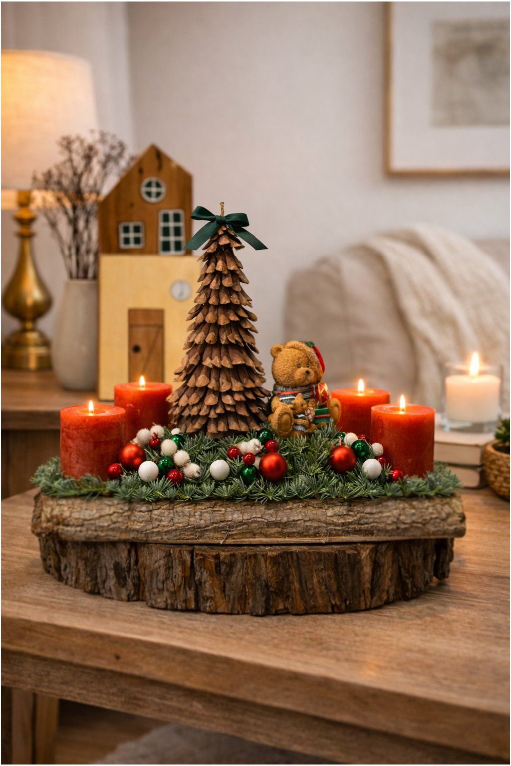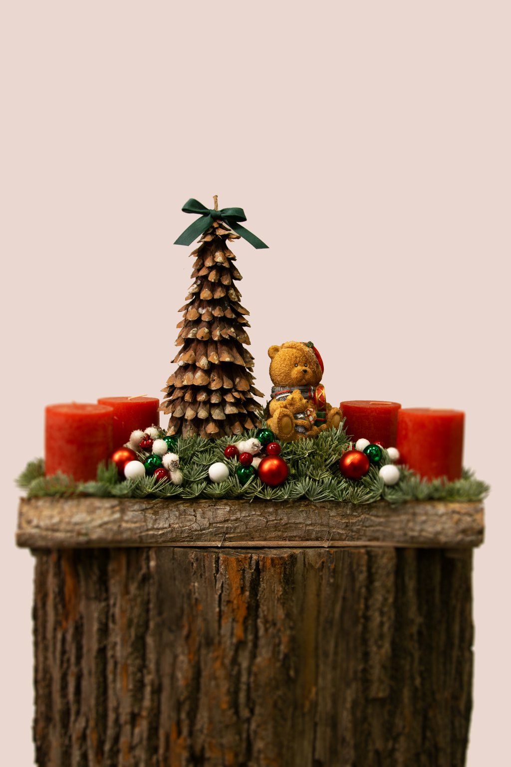 Táto originálna adventná dekorácia vytvorí v každej domácnosti príjemnú vianočnú atmosféru. Základ tvorí masívny „špalík“ s prirodzenou kôrou, na ktorom je naaranžovaná hustá umelá ihličnatá zeleň. Po stranách sú umiestnené štyri červené valcové sviečky – ideálne na postupné zapálenie počas štyroch adventných nedieľ. Stred dominujúci zdobí stromček ručne poskladaný zo šišiek, na vrchole s elegantnou zelenou mašľou, a roztomilý medvedík v zimnom oblečení, ktorý dekorácii dodáva hravý a rozprávkový nádych.