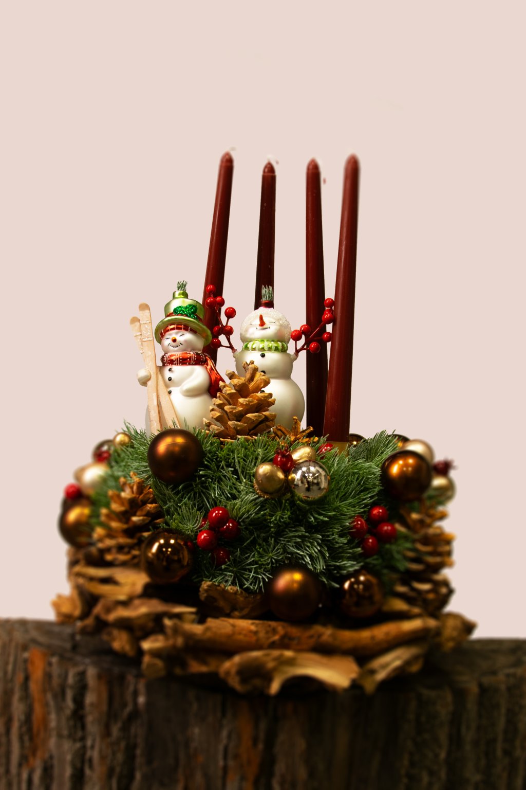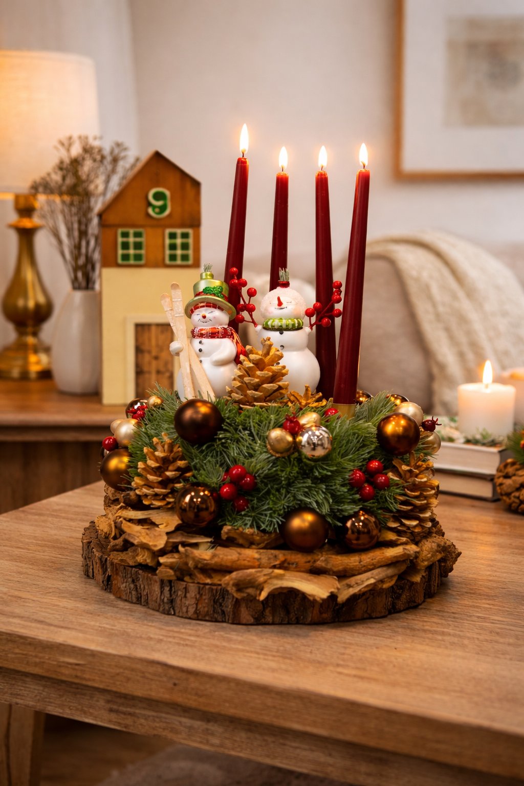 Dominantou dekorácie sú štyri úzke bordové sviečky, ideálne na postupné zapálenie počas štyroch adventných nedieľ. Medzi nimi stoja dvaja veselí snehuliaci – jeden so zeleným klobúkom a druhý s čiapkou, ozdobení šálmi a zimnými detailmi. Pôsobia hravo a vytvárajú milú zimnú scenériu, ktorá poteší dospelých aj deti.