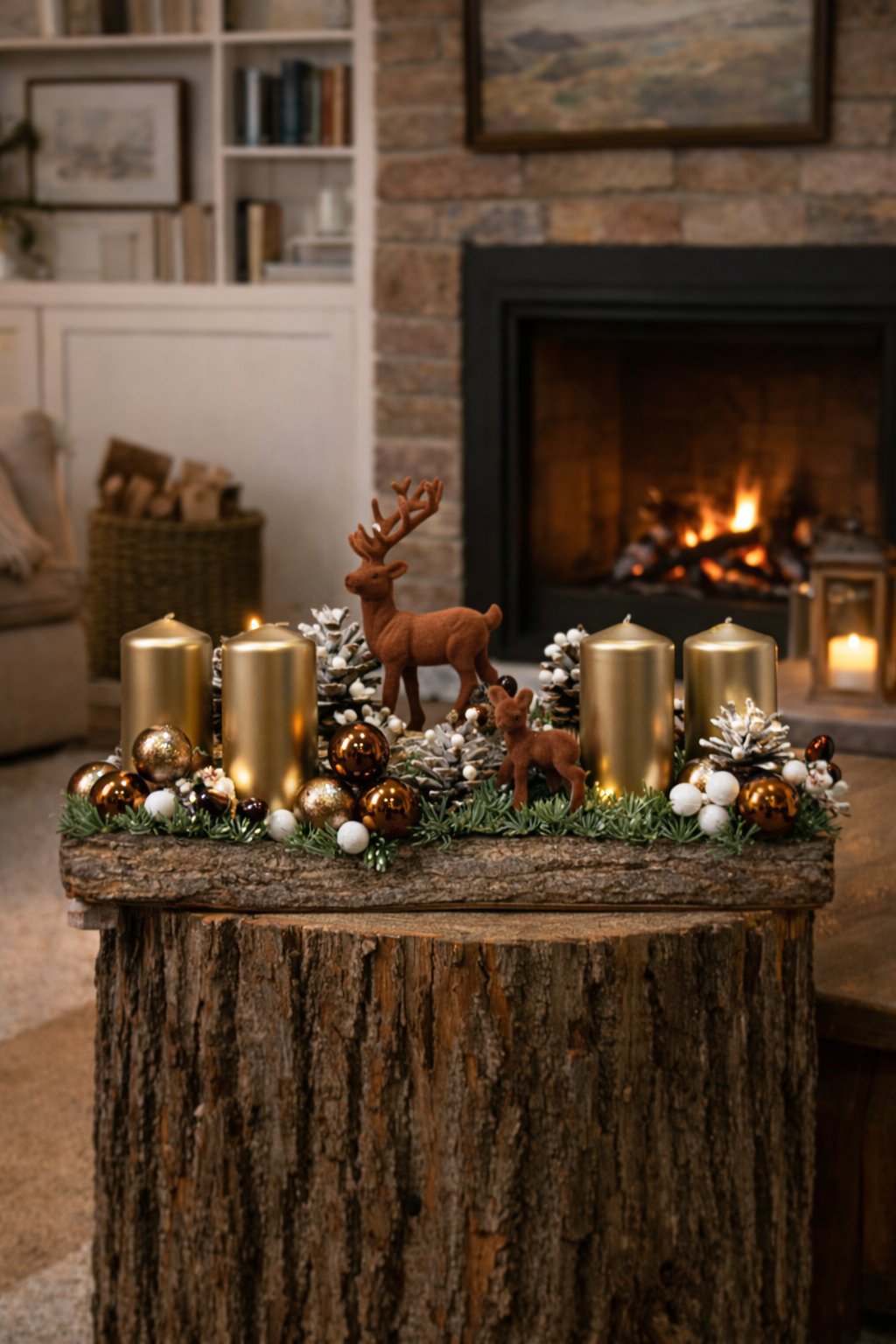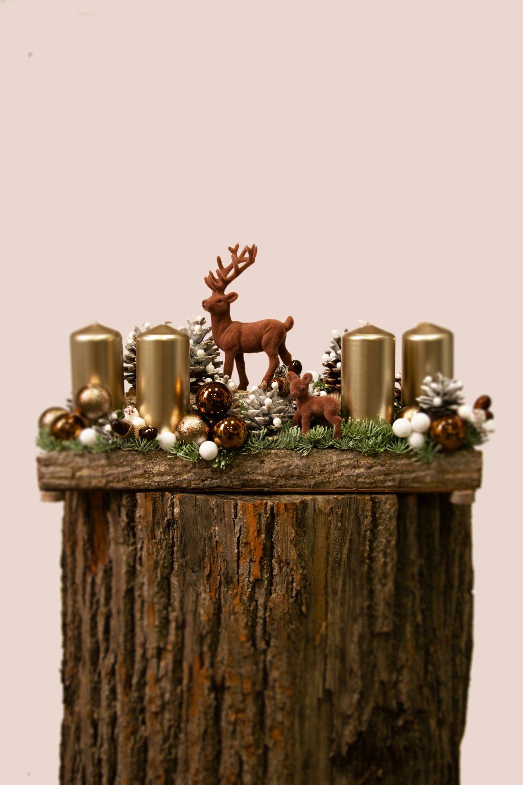Tento adventný aranžmán prinesie do vášho domova nádych zimného lesa v elegantnom prevedení. Na masívnom drevenom podklade je naaranžované husté zelené ihličie, zasnežené šišky a štyri výrazné zlaté sviece, ktoré pri zapálení vytvoria teplé, sviatočné svetlo. Dominantou dekorácie je hnedý jeleň s mláďatkom, ktorý pôsobí ako milý a zároveň noblesný detail – pripomína pokojnú prechádzku zimnou prírodou.