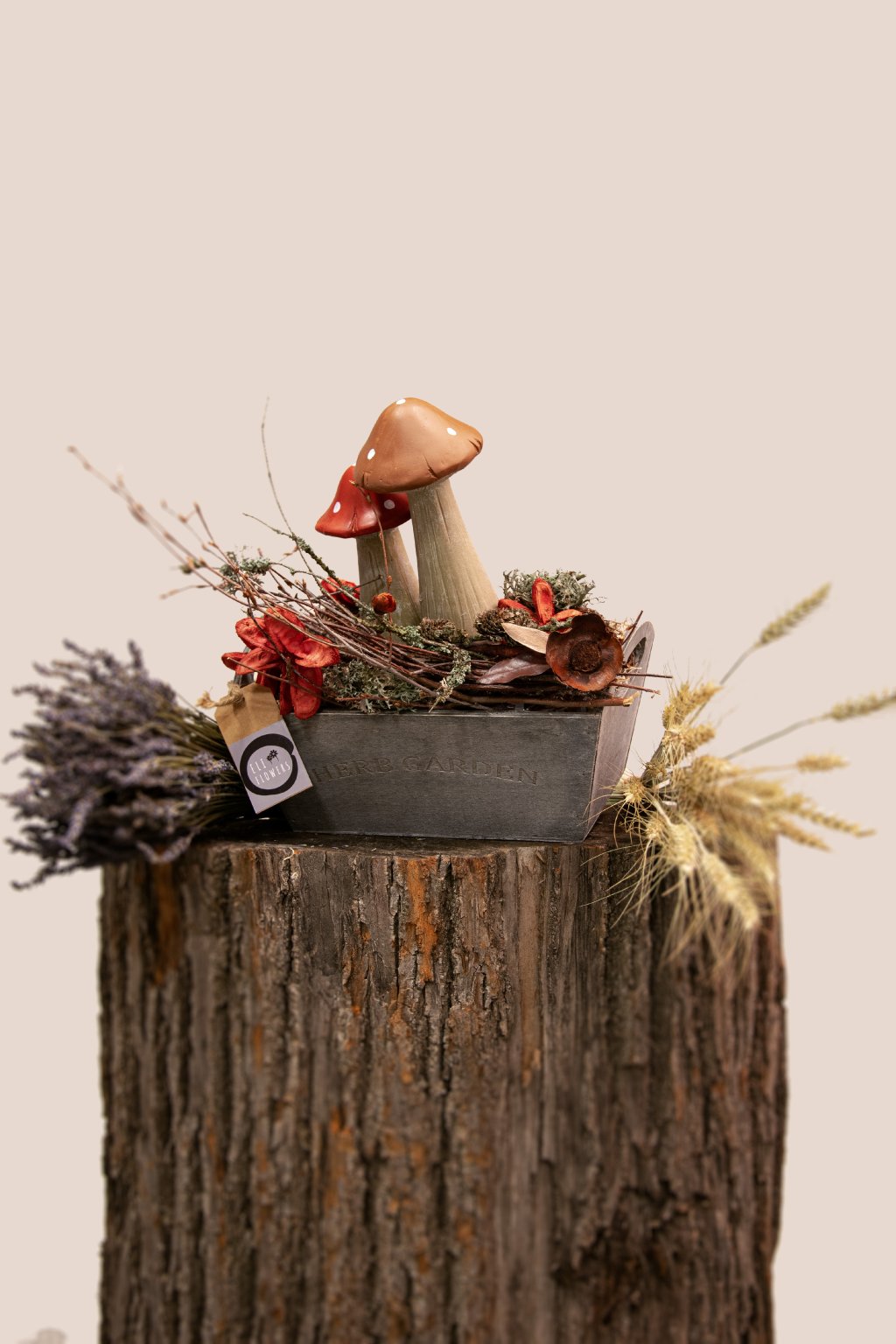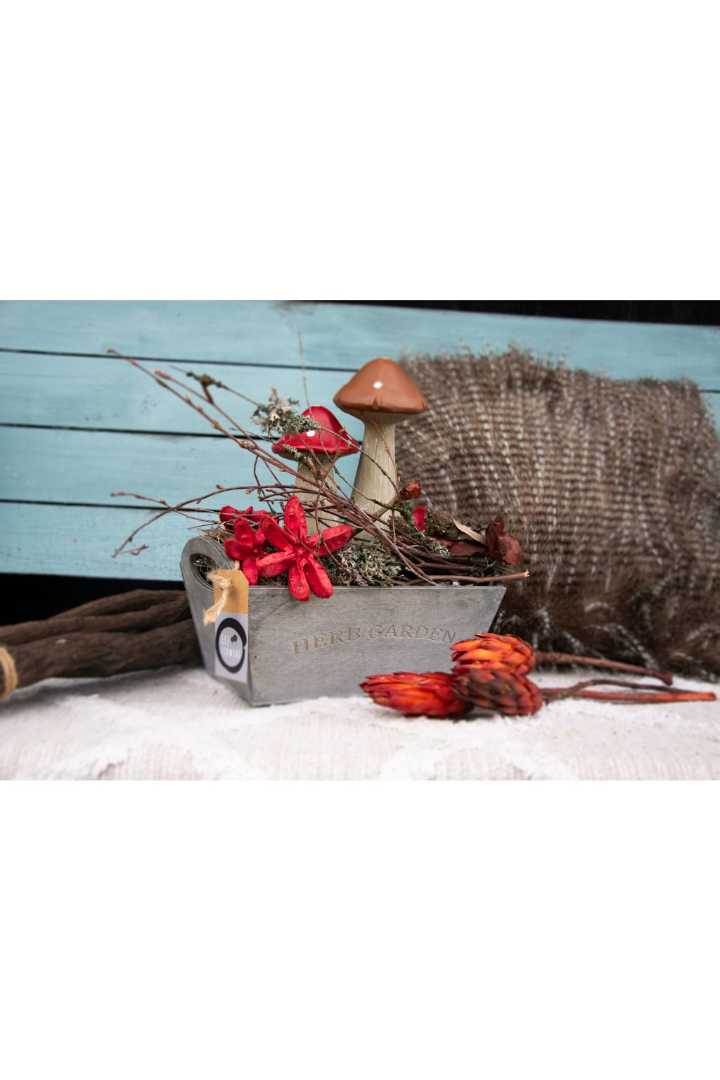 Prenes si do interiéru kúsok pokojných lesných chodníčkov. Ručne aranžovaná bednička kombinuje mach, sušené prírodniny a dekoratívne hubky v rustikálnom drevenom kvetináči. Vytvára útulnú atmosféru na stole, komode aj recepcii bez nutnosti údržby.