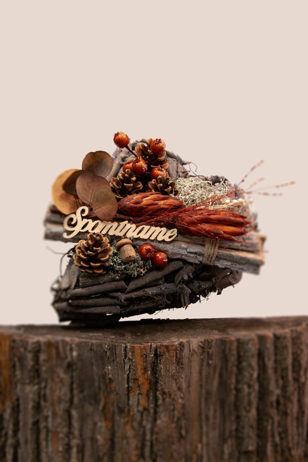 esenné spomienkové srdiečko „Spomíname“ je ručne vyrábaná prírodná dekorácia, ktorá citlivo vyjadruje úctu a spomienku na blízkych. Základ tvorí pevná konštrukcia z tmavých konárikov v tvare srdca, ktorá pôsobí rustikálne a prirodzene. Predná časť je ozdobená šiškami, umelými plodmi (šípky), calocephalus, dekoratívnymi lístkami eukalyptu a výrazným oranžovým sušeným kvetom Protea, ktorý aranžmánu dodáva hrejivý jesenný nádych.