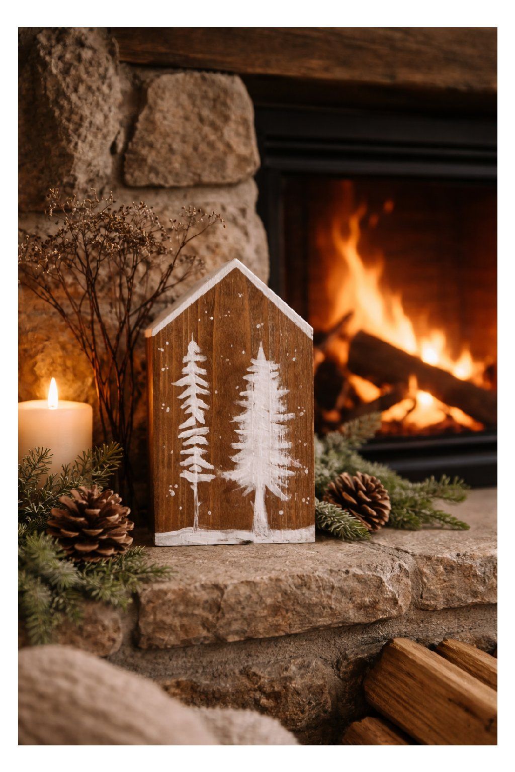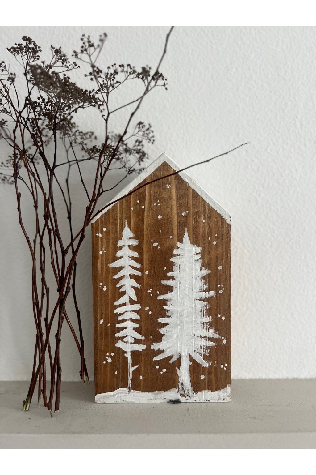 Drevený domček s ručne maľovaným zimným motívom zasnežených stromov je jemná a nadčasová dekorácia, ktorá vnesie do interiéru pokoj a útulnú atmosféru. Prírodná kresba dreva v kombinácii s bielymi detailmi pôsobí čisto, minimalisticky a krásne zapadne do škandinávskeho, rustikálneho aj prírodného štýlu bývania.