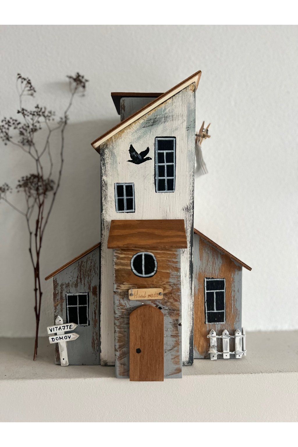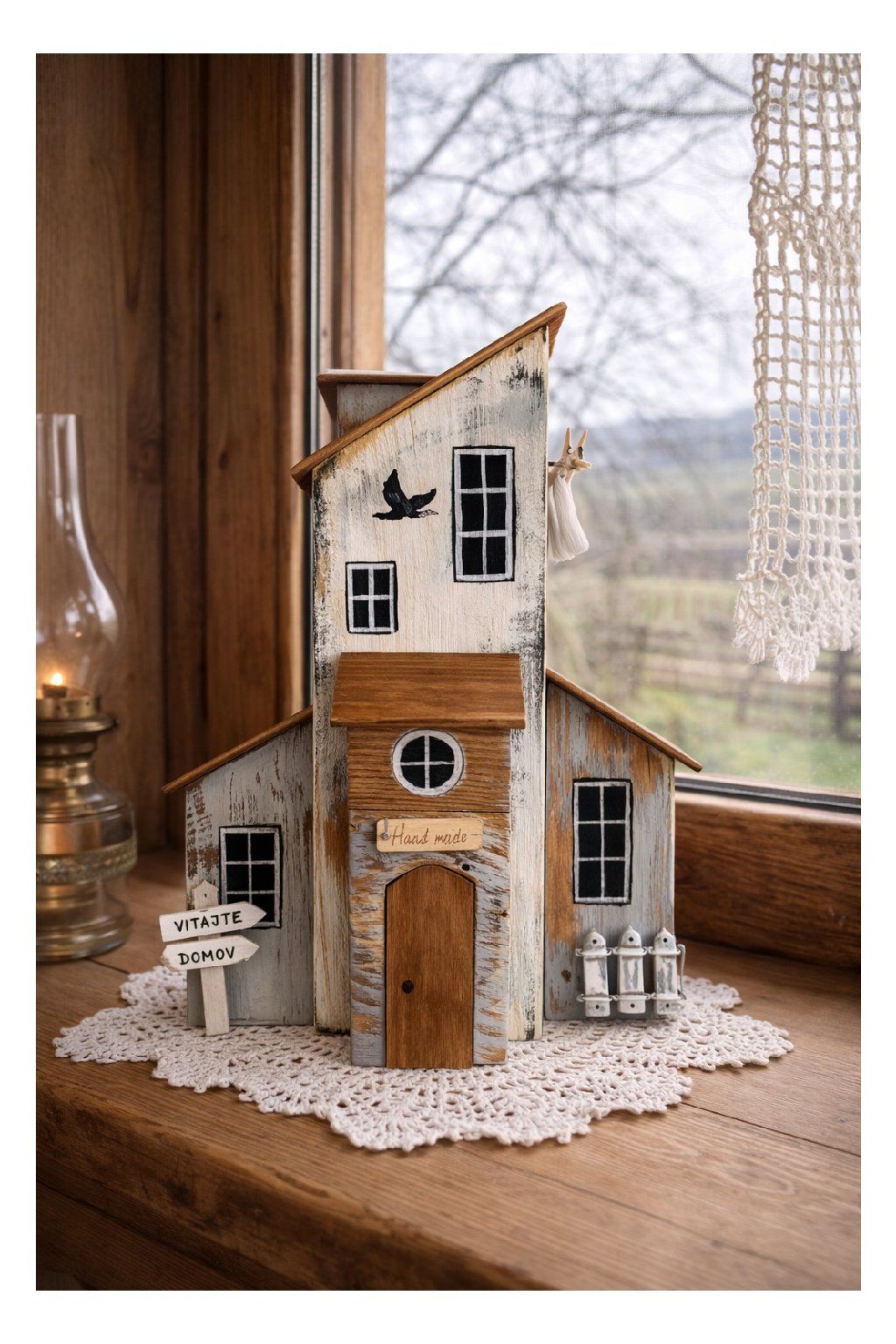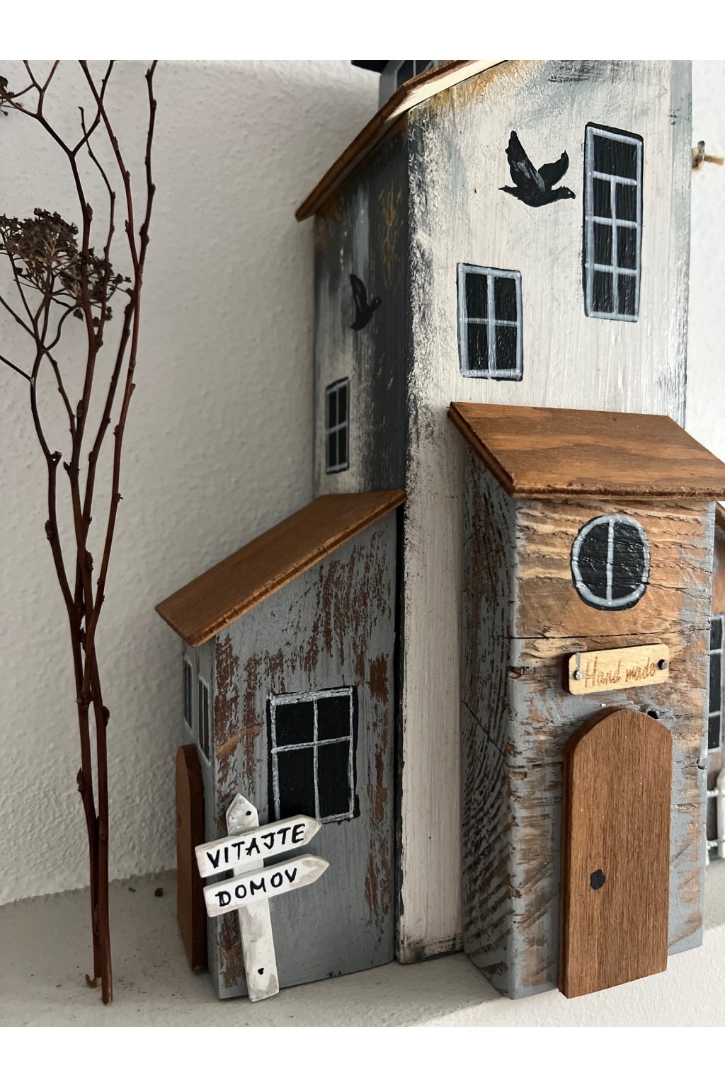 Tento ručne vyrobený drevený domček „Vitajte domov“ pôsobí ako malá rozprávková usadlosť, ktorá privíta každého, kto vojde do vášho domova. Je maľovaný v jemných odtieňoch bielej, sivej a teplého dreva s patinou, takže vyzerá, akoby si niesol svoj vlastný príbeh.
