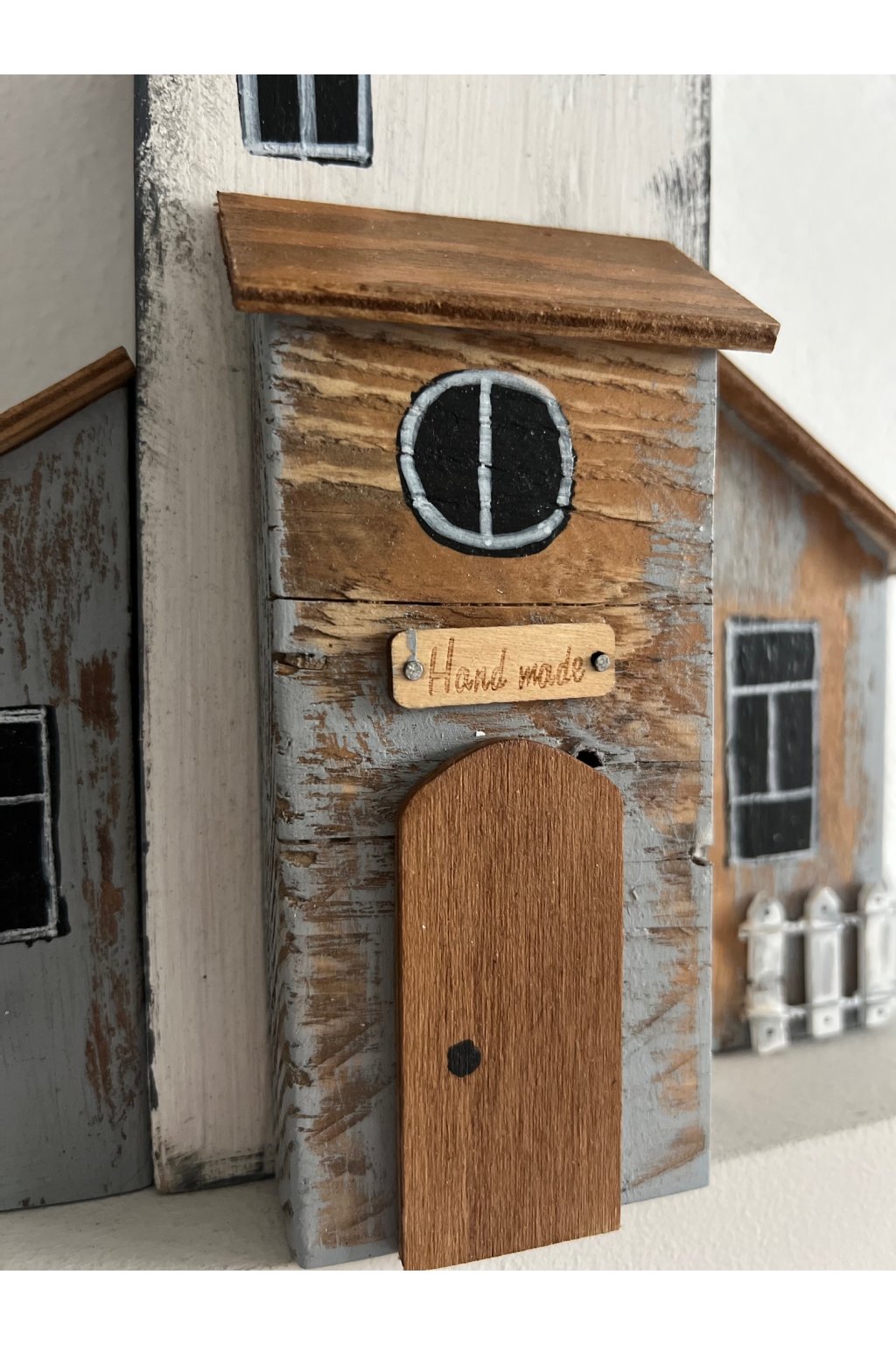 Dominantou je vysoká stredná časť so šikmou strechou, okrúhlym okienkom a drevenými dvierkami. Nad nimi je drobná tabuľka handmade, ktorá pripomína, že ide o poctivú ručnú prácu. Po bokoch sa nachádzajú dve nižšie „krídla domu“ so šikmými strechami a maľovanými oknami, ktoré vytvárajú dojem malého domčeka s prístavkami.