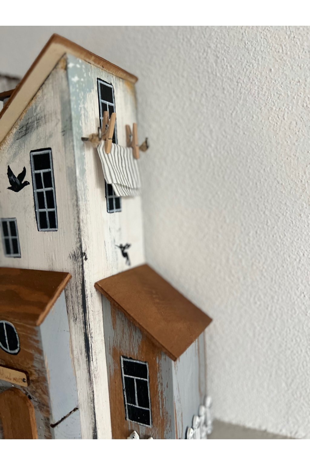 Vďaka neutrálnym farbám sa domček ľahko kombinuje so škandinávskym, rustikálnym aj boho štýlom. Krásne vynikne v predsieni ako uvítací prvok, na komode v obývačke či na polici spolu s ďalšími dekoráciami. Je tiež skvelým darčekom pre tých, ktorí milujú originálne, ručne robené kúsky.