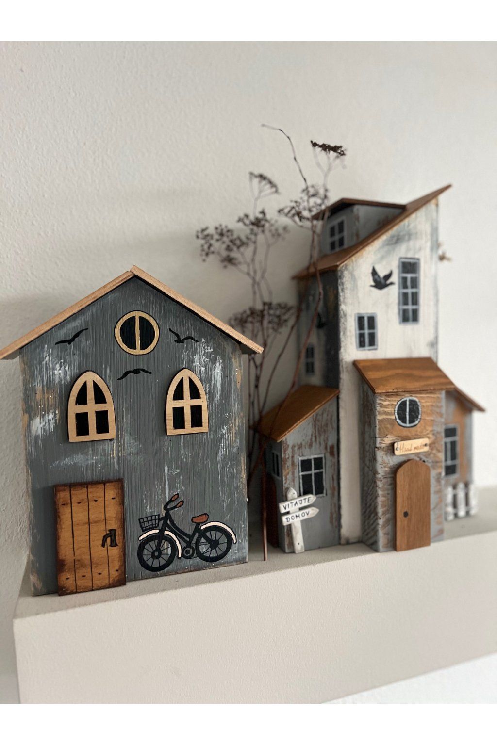 Tento ručne vyrobený drevený domček je originálna dekorácia, ktorá do interiéru prinesie atmosféru pokojnej uličky v meste. Fasáda je maľovaná na tmavosivo s jemnou patinou a „ošúchaným“ efektom, vďaka čomu pôsobí prirodzene a trošku industriálne.