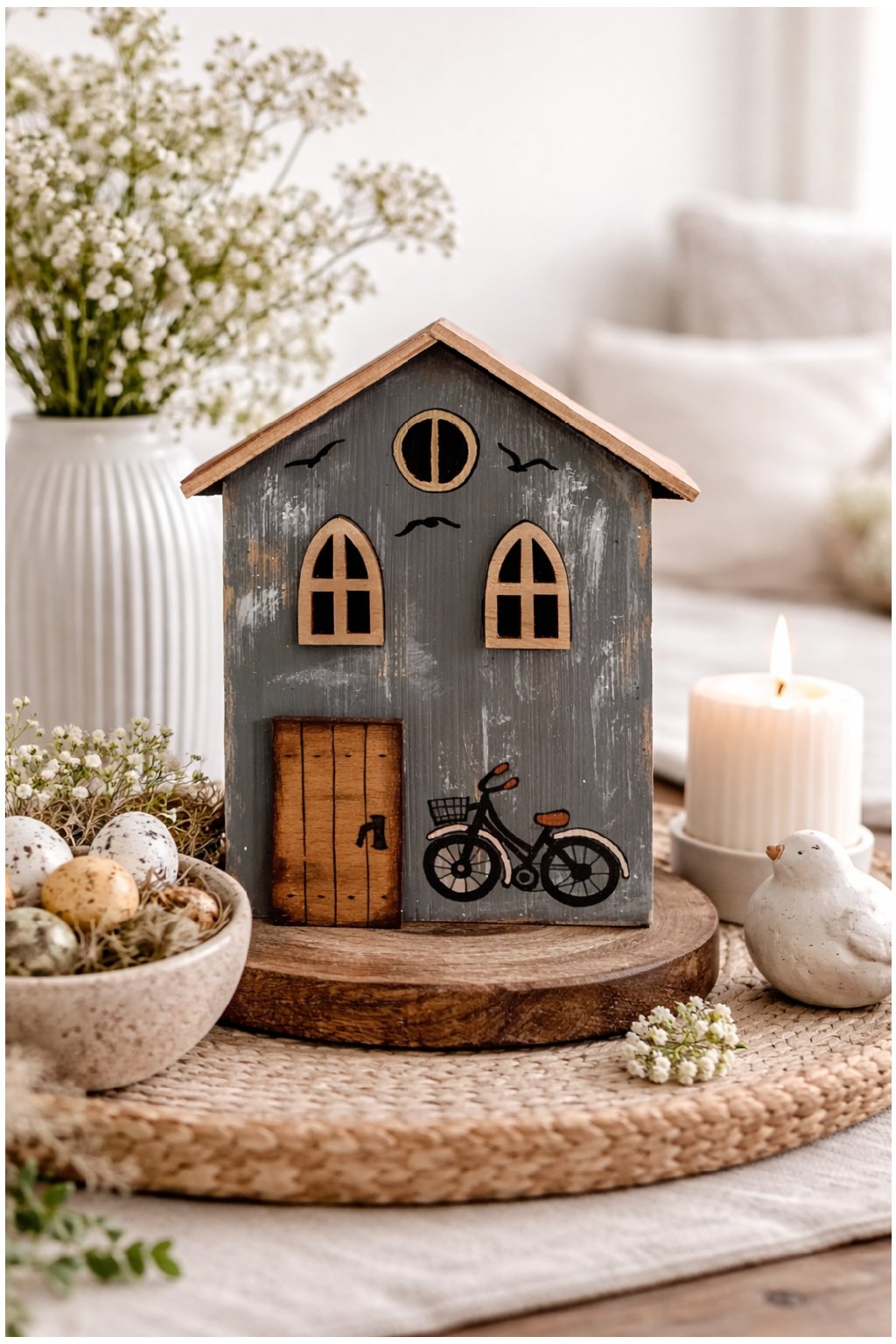 Domček krásne vynikne na polici, komode, okennom parapete alebo v kombinácii s ďalšími drevenými domčekmi. Vďaka neutrálnym farbám sa ľahko kombinuje so škandinávskym, moderným aj rustikálnym štýlom a je vhodný ako originálny darček pre milovníkov ručne robených dekorácií či cyklistiky.