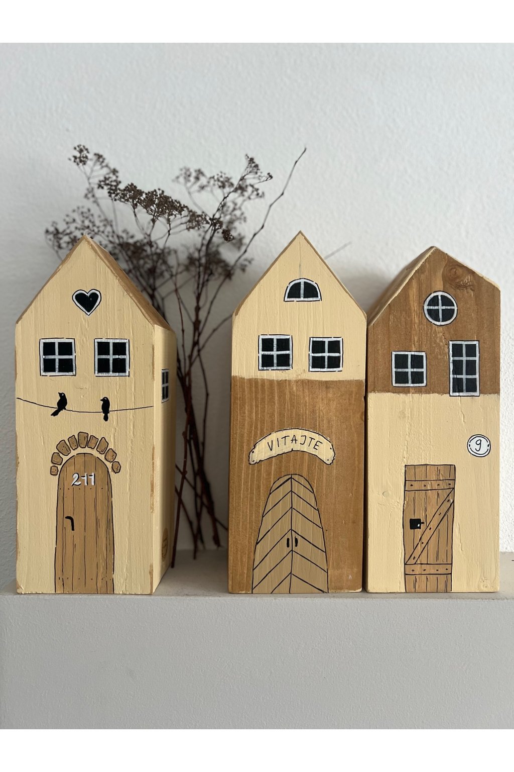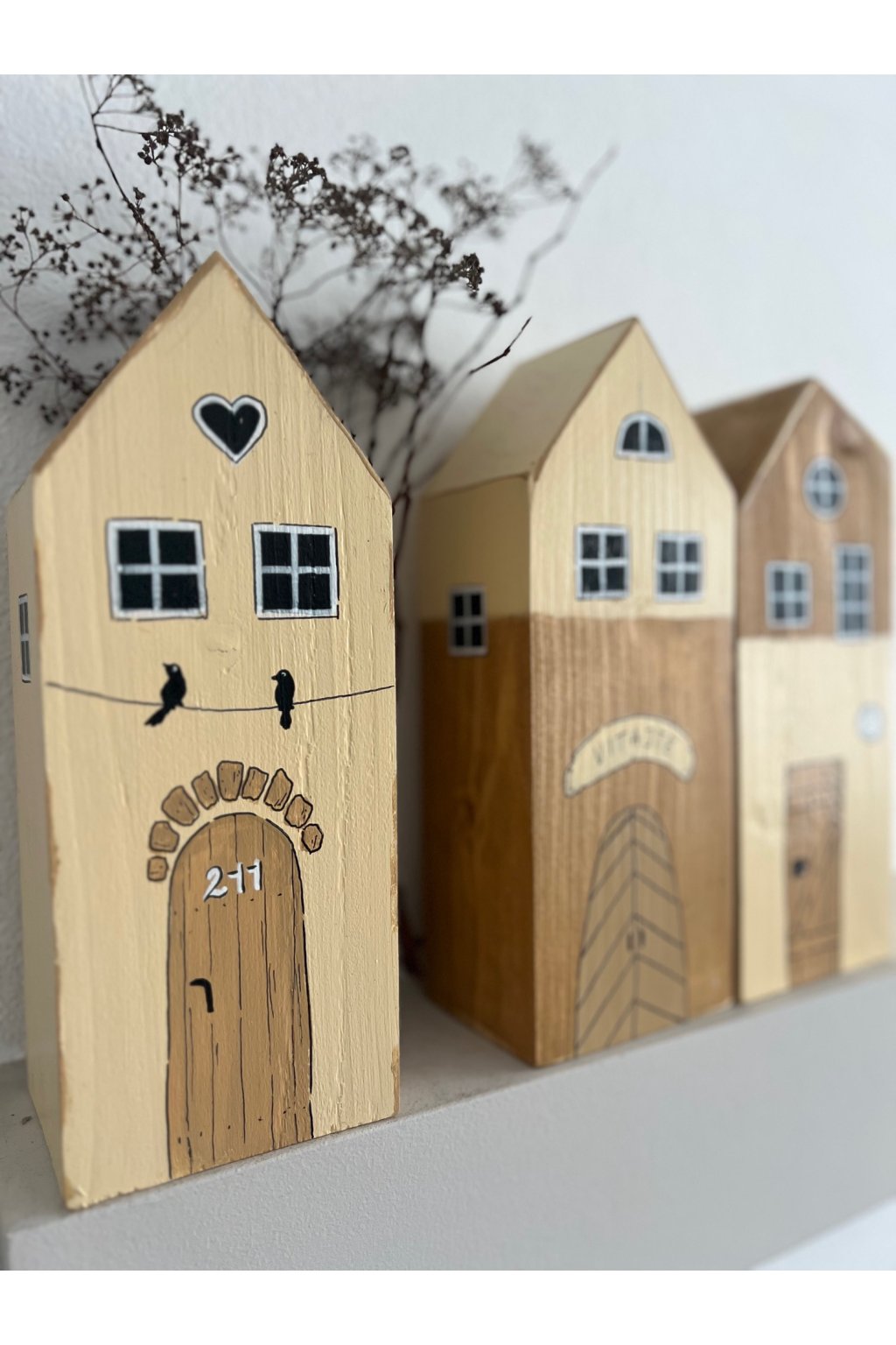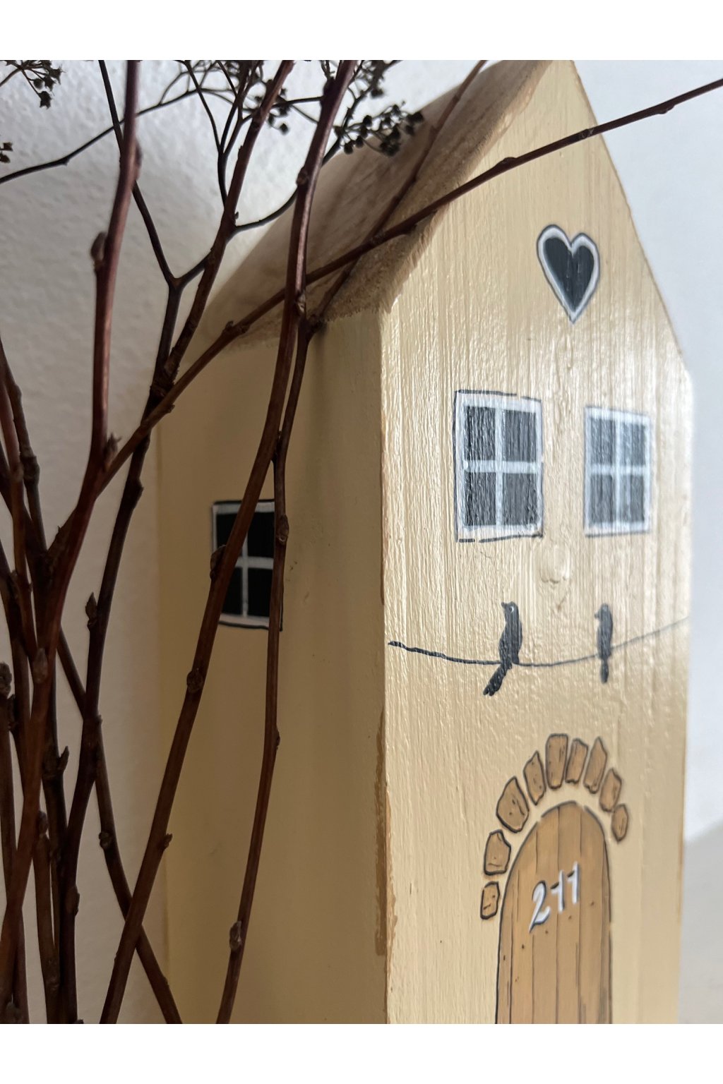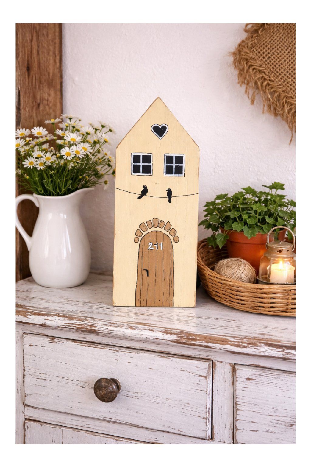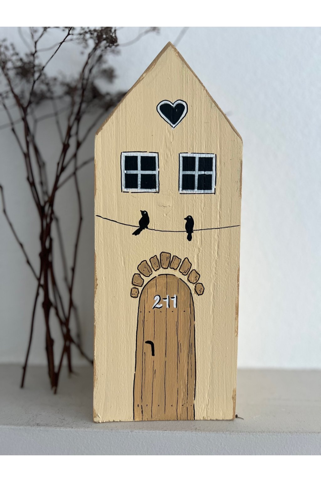 Drevený domček s ručne maľovanými detailmi je nežná a originálna dekorácia, ktorá vnesie do interiéru teplo a pocit domova. Jemná svetlá fasáda dopĺňajú kontrastné okienka, čierne srdiečko pod strechou a drobný motív dvoch vtáčikov sediacich na „drôte“, ktorý pôsobí hravo a zároveň veľmi útulne. Dominantou sú maľované drevené dvere s kamenným oblúkom a číslom 277, vďaka čomu má každý kus svoj jedinečný charakter.