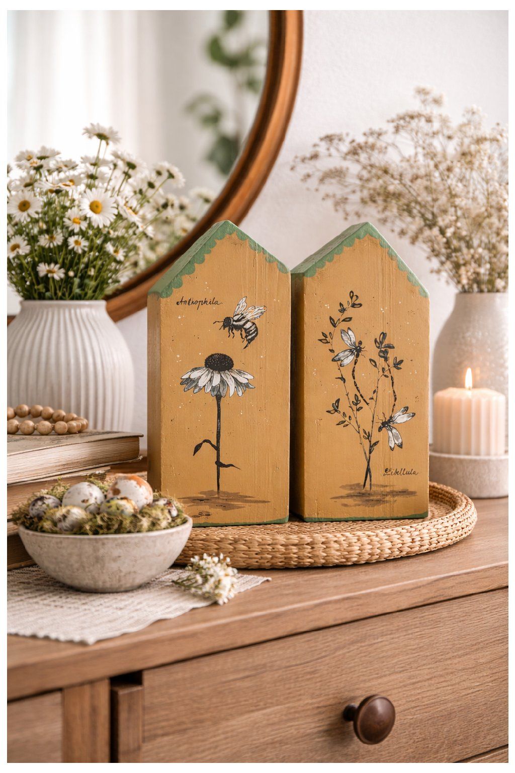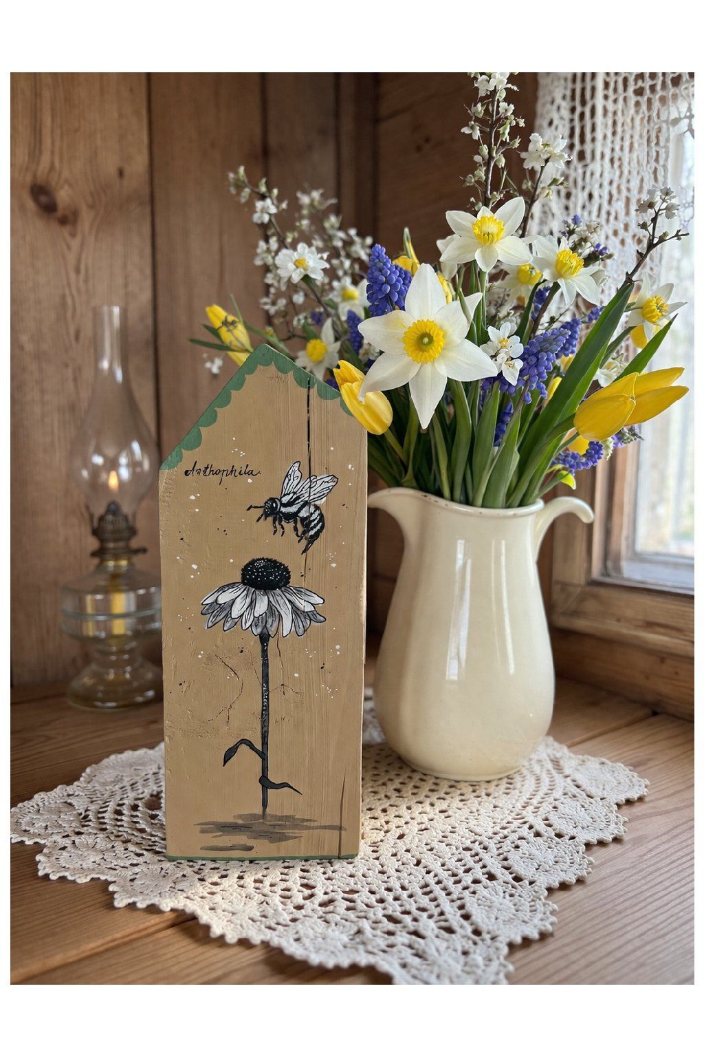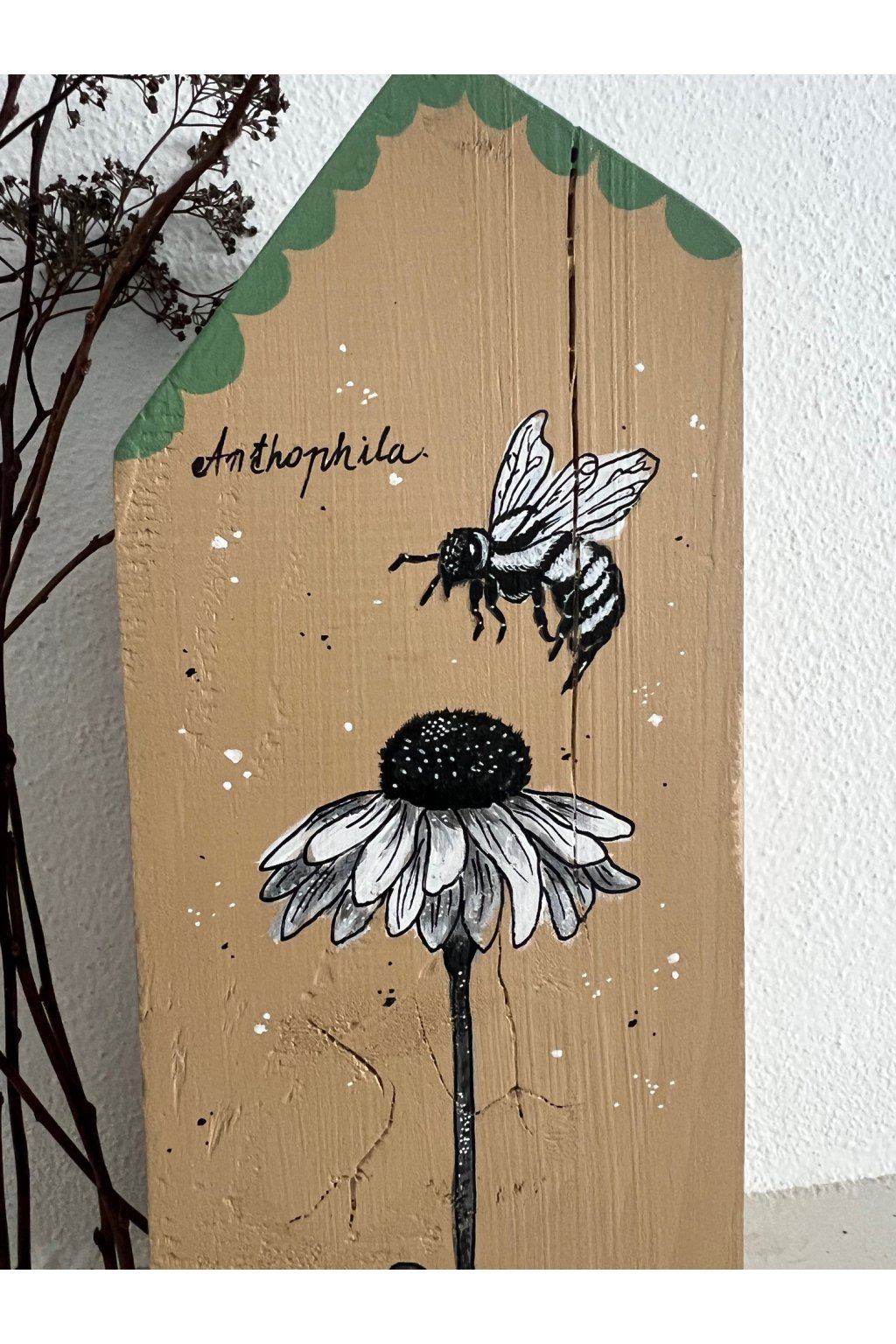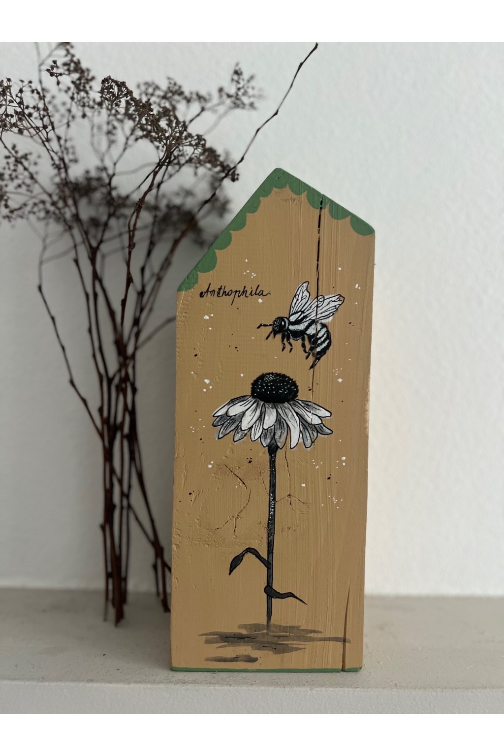 Ručne maľovaný drevený domček s motívom včielky a kvetu je jemná prírodná dekorácia, ktorá vnesie do interiéru pokoj a útulnosť. Na prednej strane domčeka je detailná ilustrácia včely pri kvete v čierno-bielej kresbe, doplnená drobnými bodkami a decentným zeleným lemovaním v hornej časti. Celkový vzhľad pôsobí minimalisticky, no zároveň veľmi originálne – ideálny doplnok do prírodne ladených, vidieckych aj moderných priestorov.