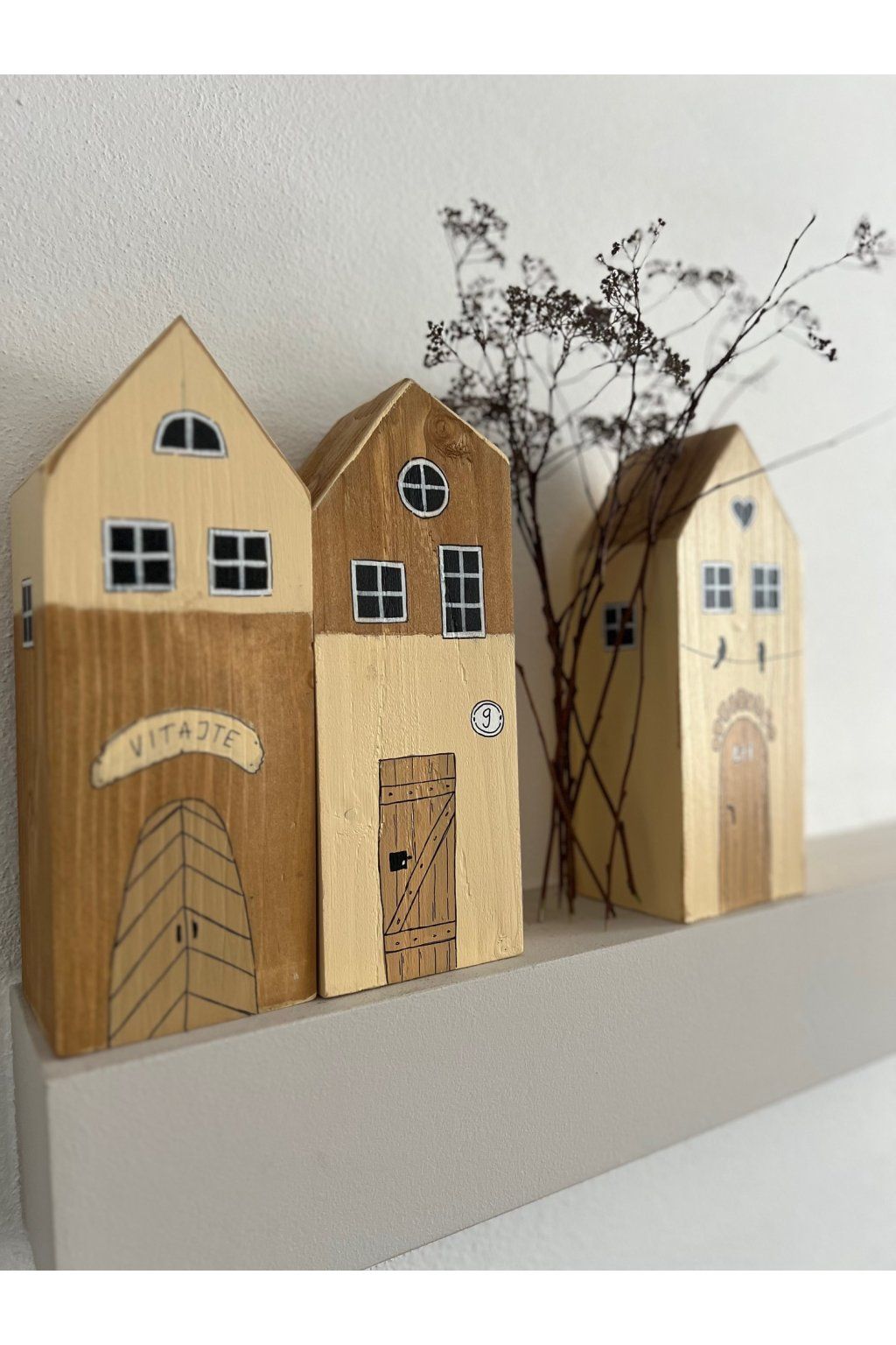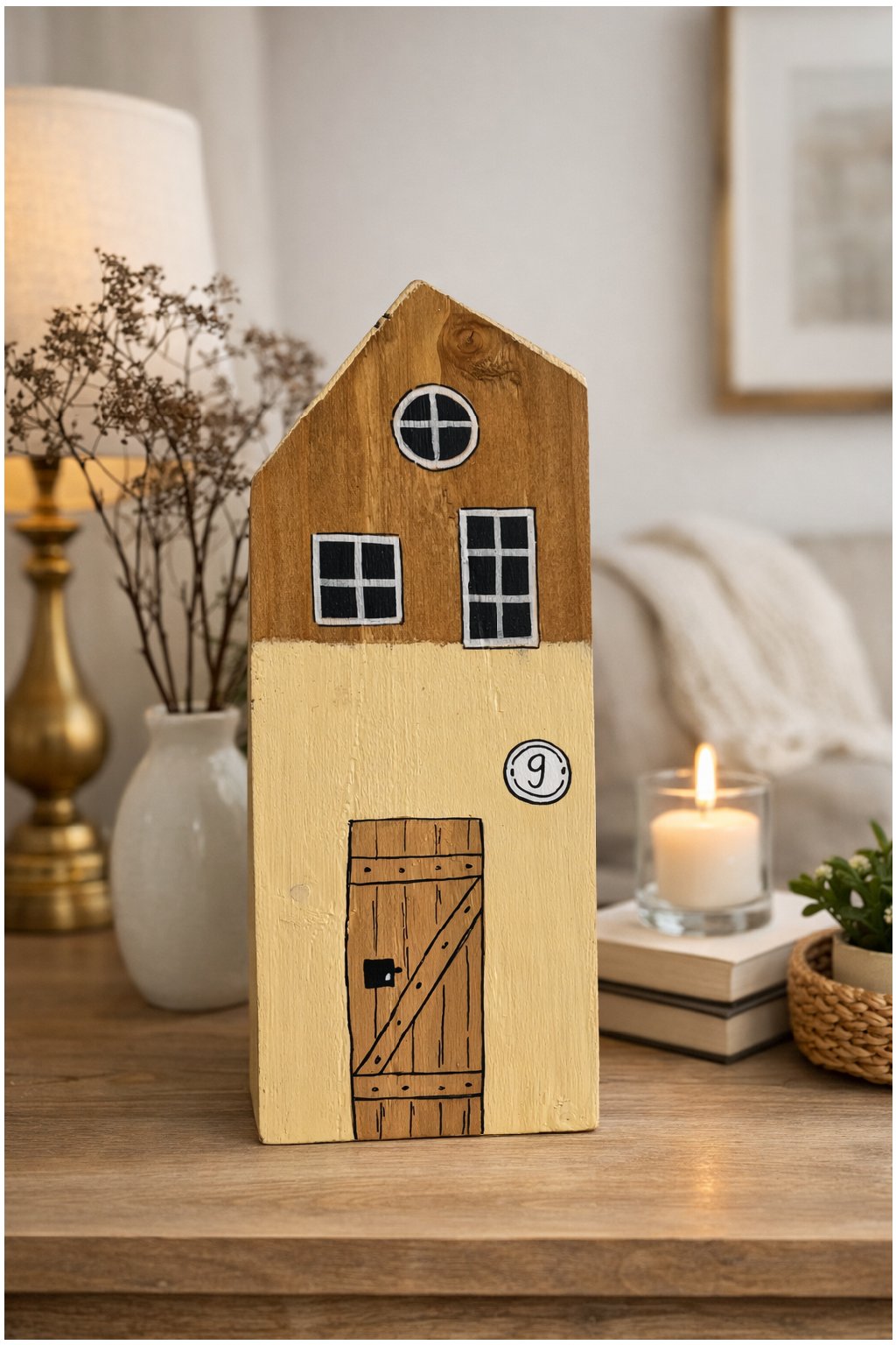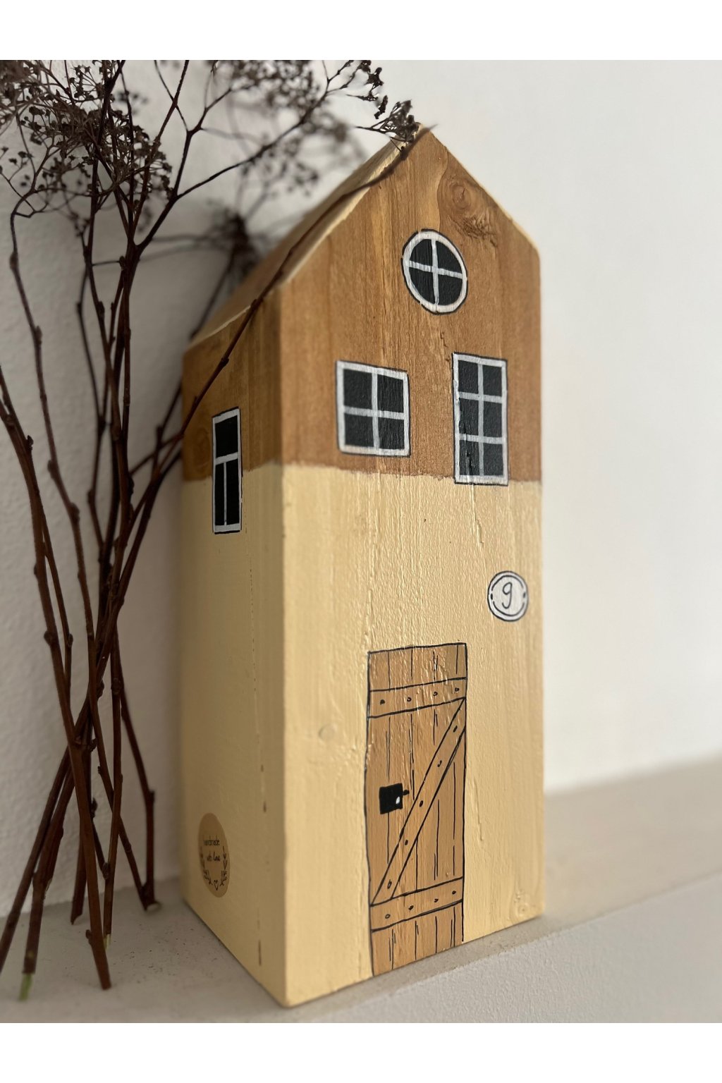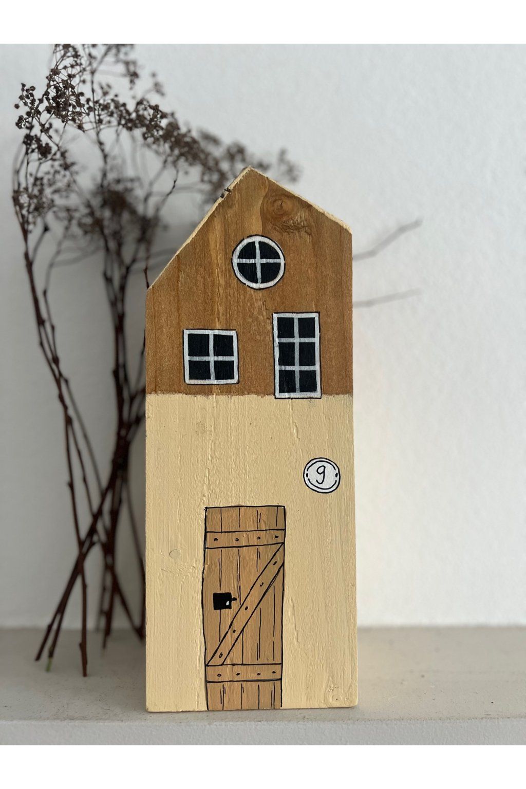 Drevený domček v jemných prírodných tónoch je ručne maľovaná dekorácia, ktorá pôsobí jednoducho, útulne a nadčasovo. Kombinácia prírodného dreva a svetlej fasády dopĺňajú precízne maľované okienka, výrazné drevené dvere a drobný detail s číslom 9, vďaka ktorému má domček osobitý charakter.