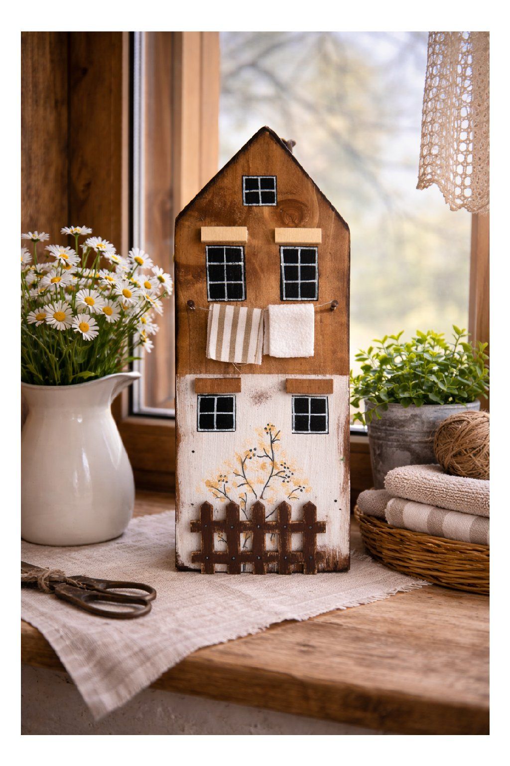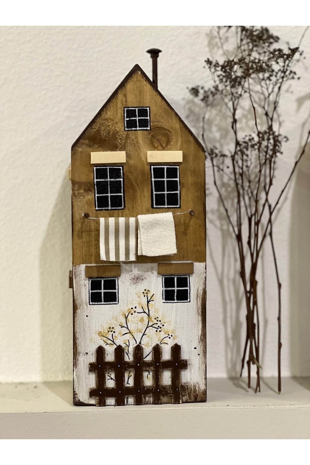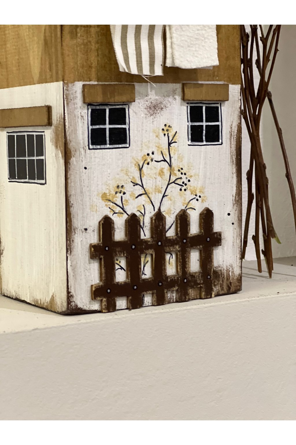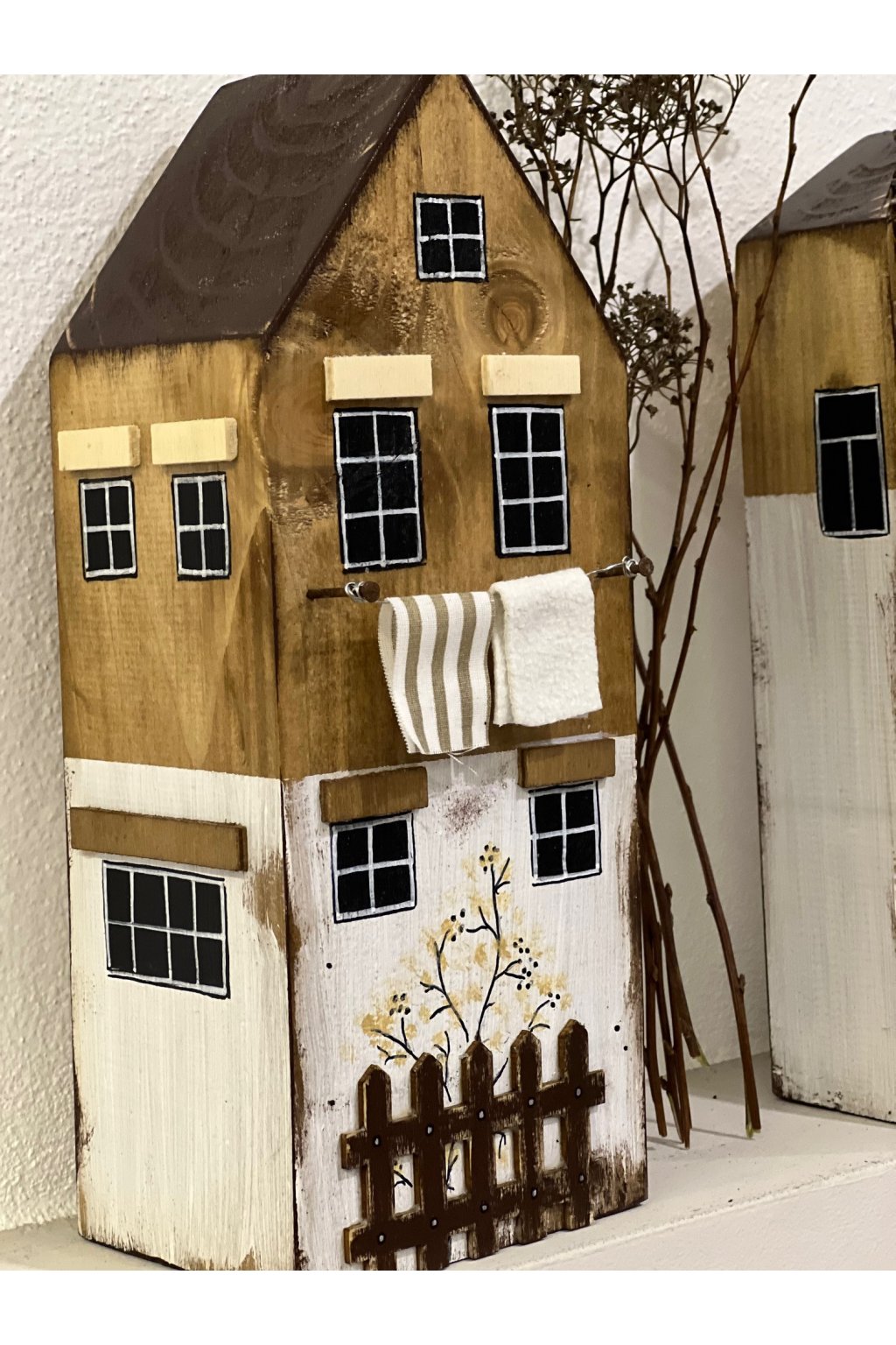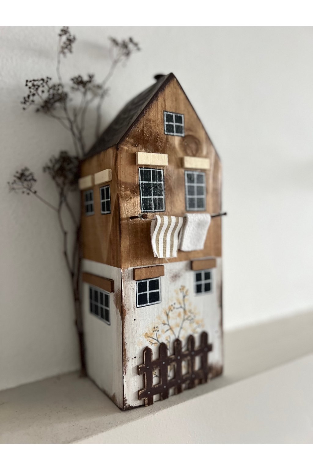 Tento pôvabný drevený domček je ručne vyrobená a maľovaná dekorácia, ktorá do interiéru prinesie hrejivú, vidiecku atmosféru. Predná strana je rozdelená na „prízemie“ a „poschodie“ – spodná časť je bielo patinovaná s jemnou maľbou kvetov a malým trojrozmerným plotíkom, horná časť má prirodzenú farbu dreva. Okná sú ručne maľované v kontrastnej čiernej farbe s bielymi rámami, čo domčeku dodáva výraz a charakter.