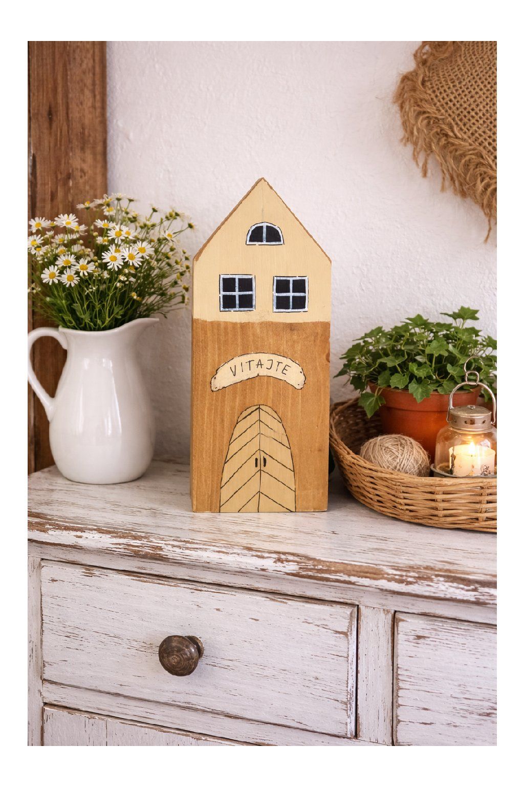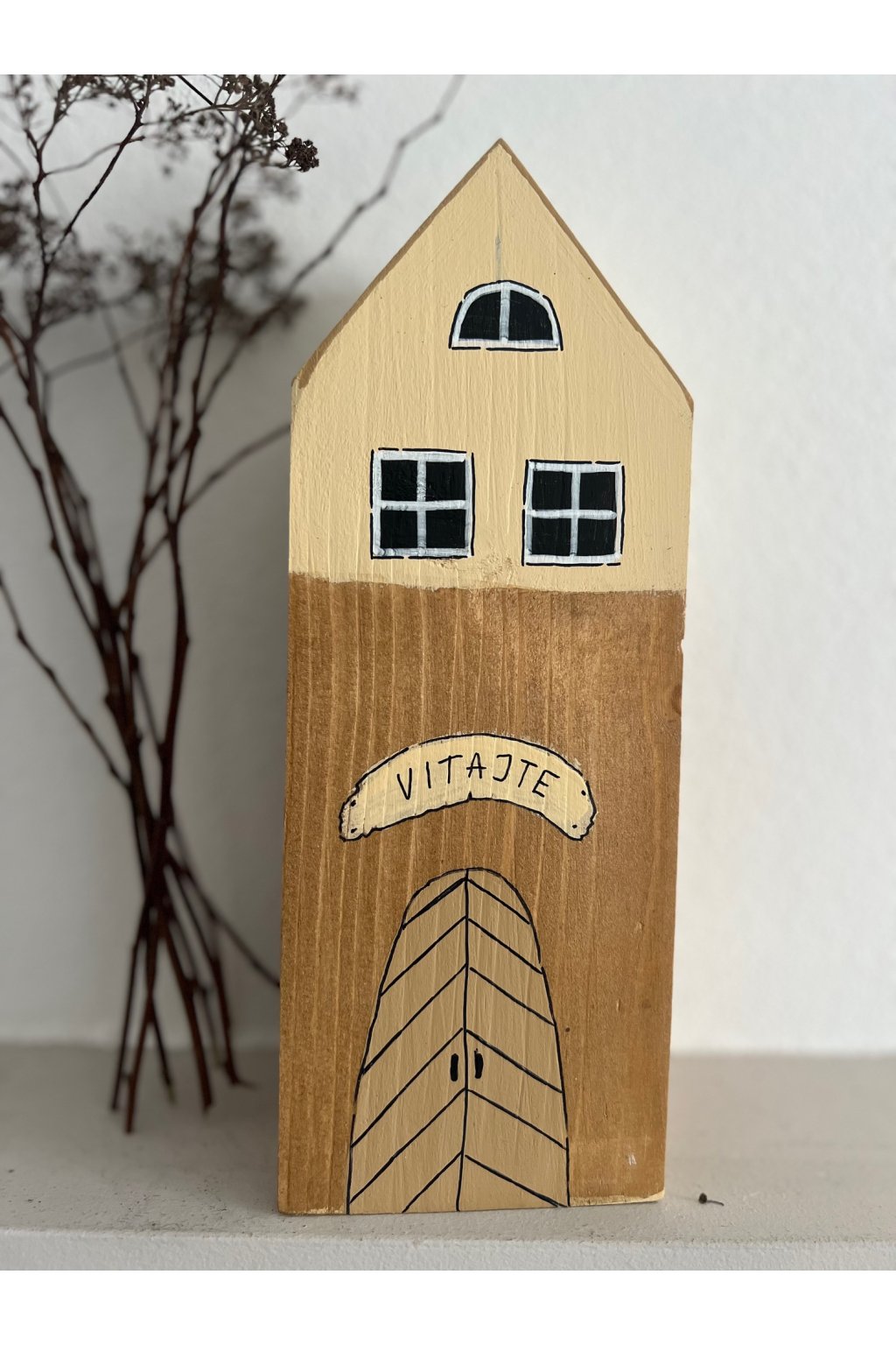 Ručne maľovaný drevený domček s nápisom „VITAJTE“ je drobný detail, ktorý okamžite zútulní domov. Je vyrobený z masívneho dreva a maľovaný v prírodných, zemitých odtieňoch – spodná časť v teplej hnedej, vrchná v jemnej krémovej. Minimalistické okienka a kreslené dvierka mu dodávajú príjemný „chalupársky“ charakter, vďaka ktorému sa hodí do moderného aj rustikálneho interiéru.