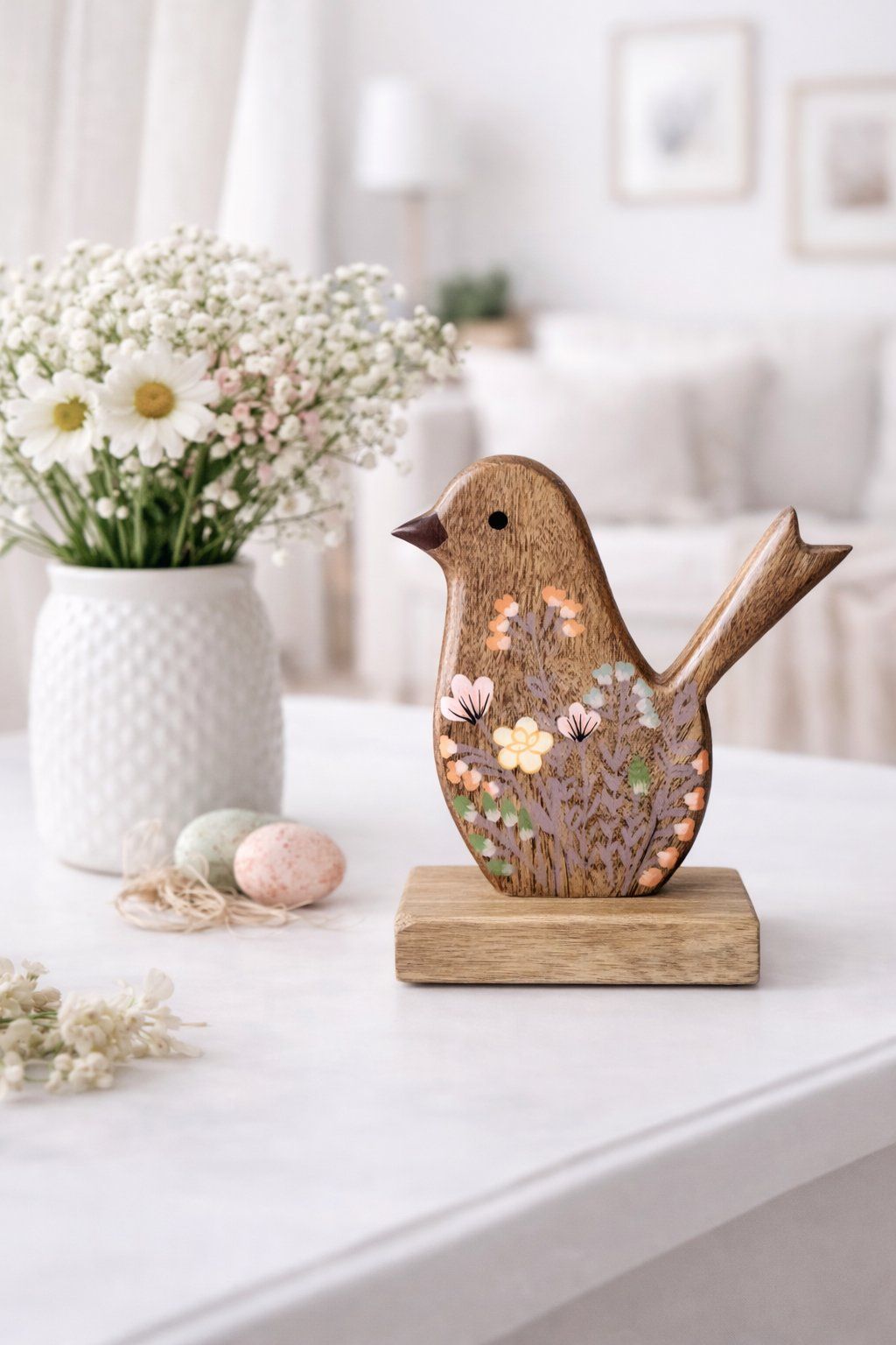 Vtáčik je doplnený o krásne maľované kvety v nežných farbách, vďaka čomu pôsobí vkusne, romanticky a nadčasovo. Je osadený na stabilnom podstavci, takže sa hodí na poličku, komodu, parapet či ako súčasť sezónnej aj celoročnej výzdoby.