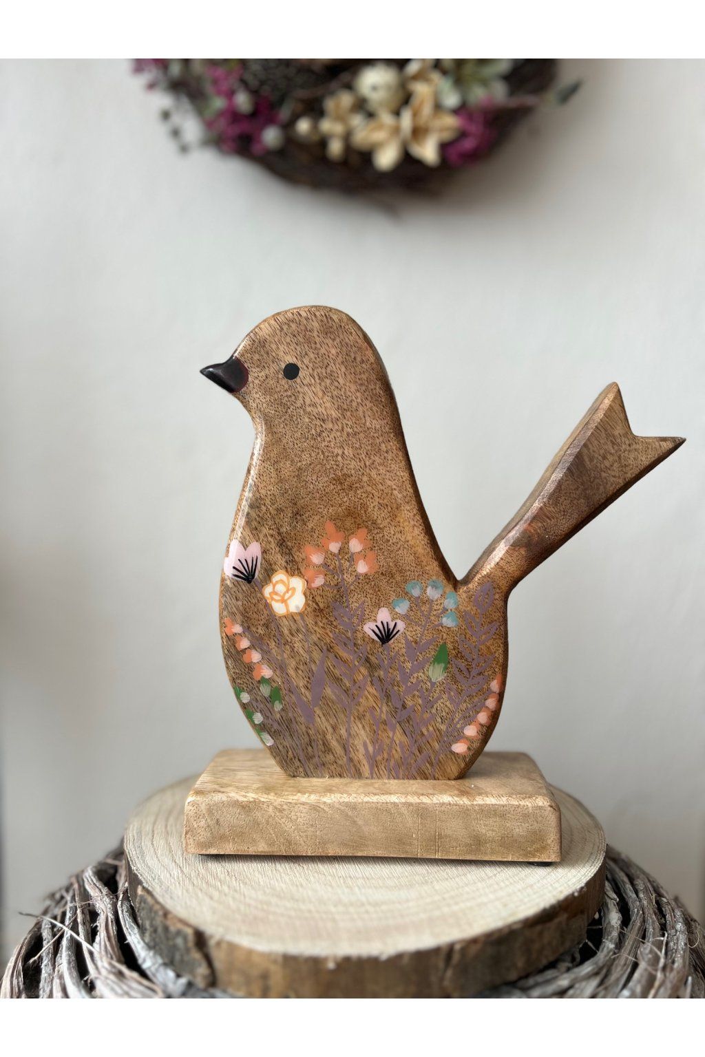Drevený vtáčik je štýlová dekorácia, ktorá skrášli interiér a dodá mu príjemnú atmosféru. Vďaka prírodnému materiálu a jemnej kvetinovej maľbe je každý kus výnimočný a pôsobí veľmi harmonicky. Hodí sa ako dekorácia do domácnosti, ale aj ako milý darček pre niekoho, kto má rád originálne a vkusné bytové doplnky.
