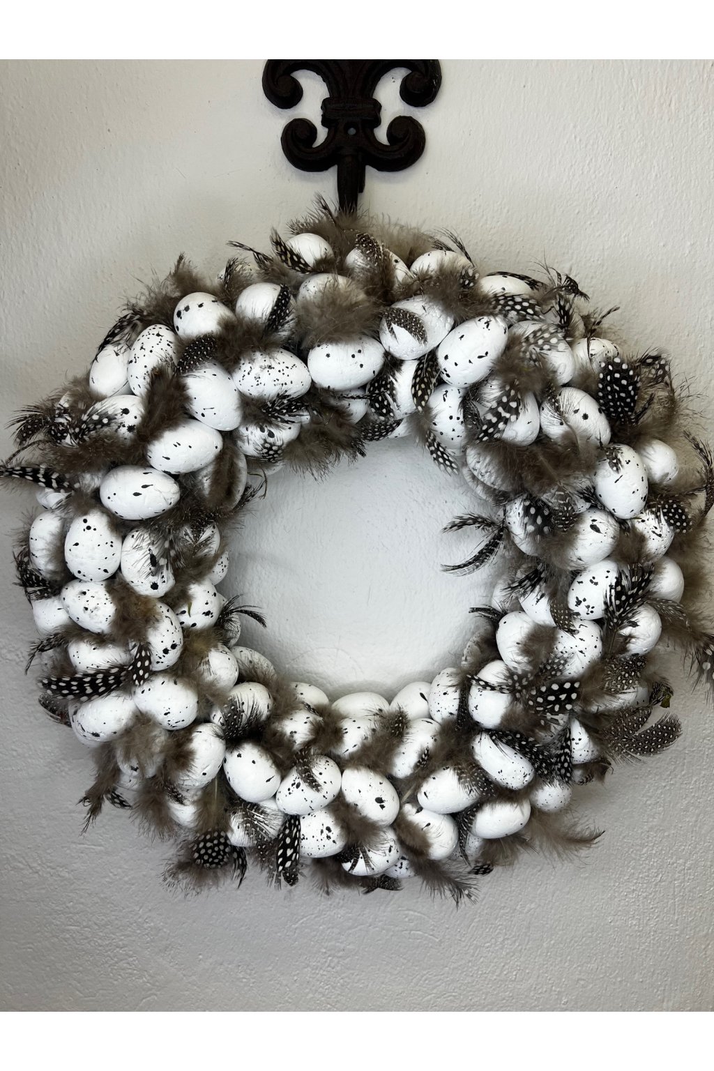 Ručne lepený veľkonočný venček v nadčasovej čierno-bielej kombinácii je bohato zdobený bielymi škvrnitými vajíčkami a jemnými pierkami, ktoré mu dodávajú ľahkosť a elegantný „hniezdny“ vzhľad. Vďaka neutrálnej farebnosti sa výborne hodí do moderného aj rustikálneho interiéru a ľahko ho zladíte s ďalšími jarnými dekoráciami. Venček vynikne na vchodových dverách, stene, okne, ale aj položený na stole či komode ako sezónna ozdoba na jar a Veľkú noc.