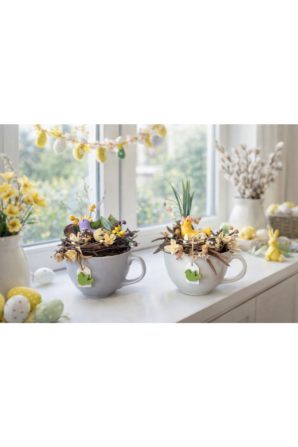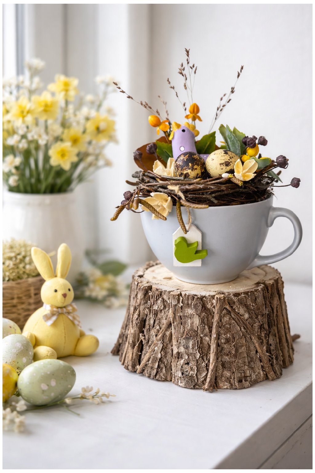 Originálny jarný aranžmán vo fialovej keramickej šálke, ktorý okamžite rozžiari interiér. V šálke je vytvorené prírodné hniezdo z prútikov a brezových vetvičiek, doplnené dekoratívnymi prepeličími vajíčkami a jarnými ozdobami v teplých žltých a prírodných tónoch. Celok pôsobí sviežo, hravo a zároveň vkusne – krásne vynikne na stole, poličke, komode či ako sezónna dekorácia do vstupnej chodby.