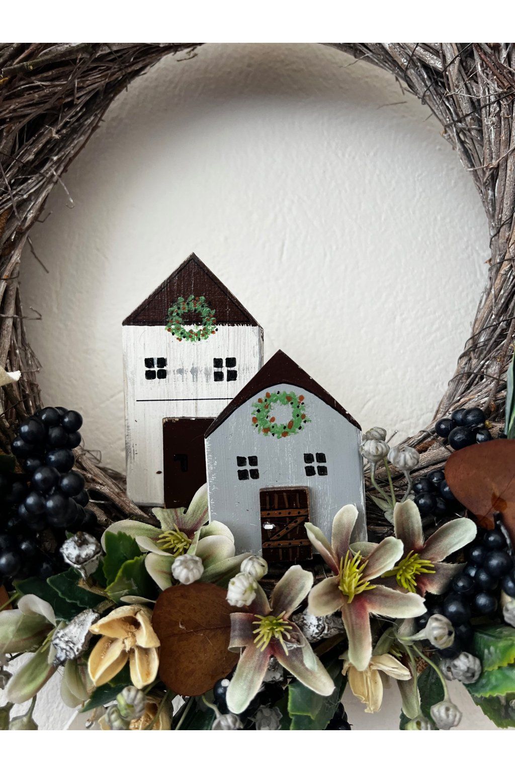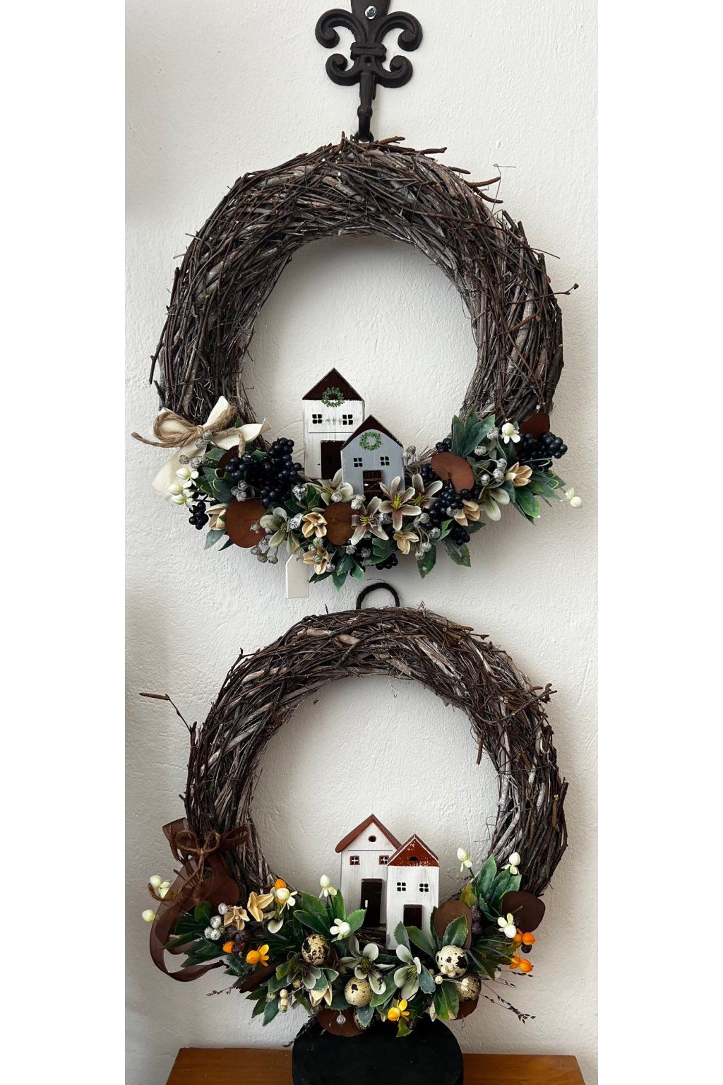 - Masívne drevené domčeky – kvalitný detail, ktorý robí venček výnimočným a trvácnym.