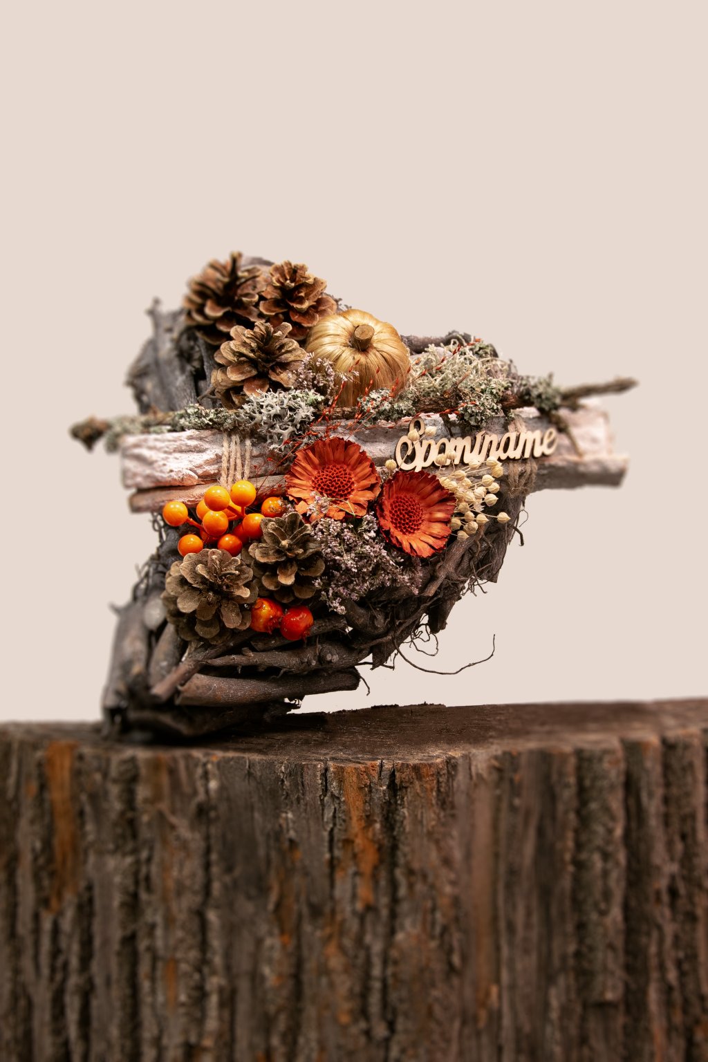 Jesenné spomienkové srdiečko „Spomíname“ je ručne vyrábaná prírodná dekorácia, ktorá jemne a dôstojne vyjadruje úctu k blízkym. Základ tvorí pevná konštrukcia z konárikov v tvare srdca, ktorá pôsobí rustikálne a prirodzene. Predná časť je bohato zdobená šiškami , drobnou dekoračnou tekvičkou, oranžovými kvetmi a umelými plodmi šípky, doplnená o jemné sušené trávy. Drevený nápis „Spomíname“ krásne vystupuje v popredí a dotvára osobný charakter aranžmánu.