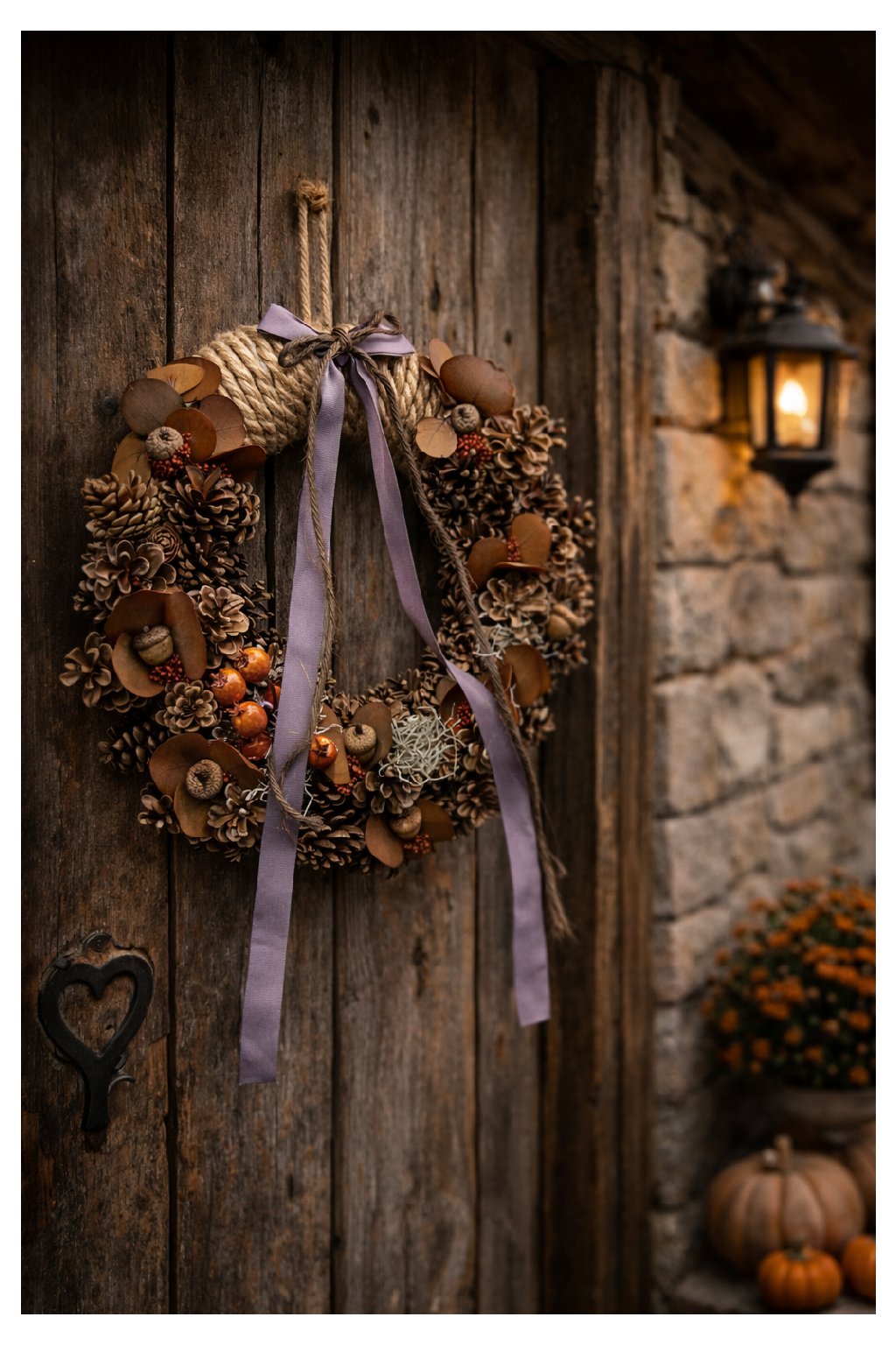 Ručne robený veniec s bohatou textúrou šišiek a prírodných plodov. Horná časť základu je elegantne omotaná prírodným povrazom, ktorý dotvára fialová (levanduľová) mašľa. Dekor je rozložený po celom obvode, v teplých jesenných tónoch s jemným farebným akcentom.