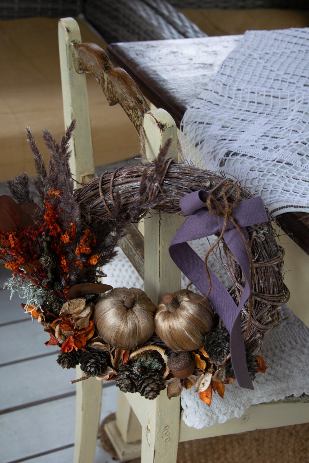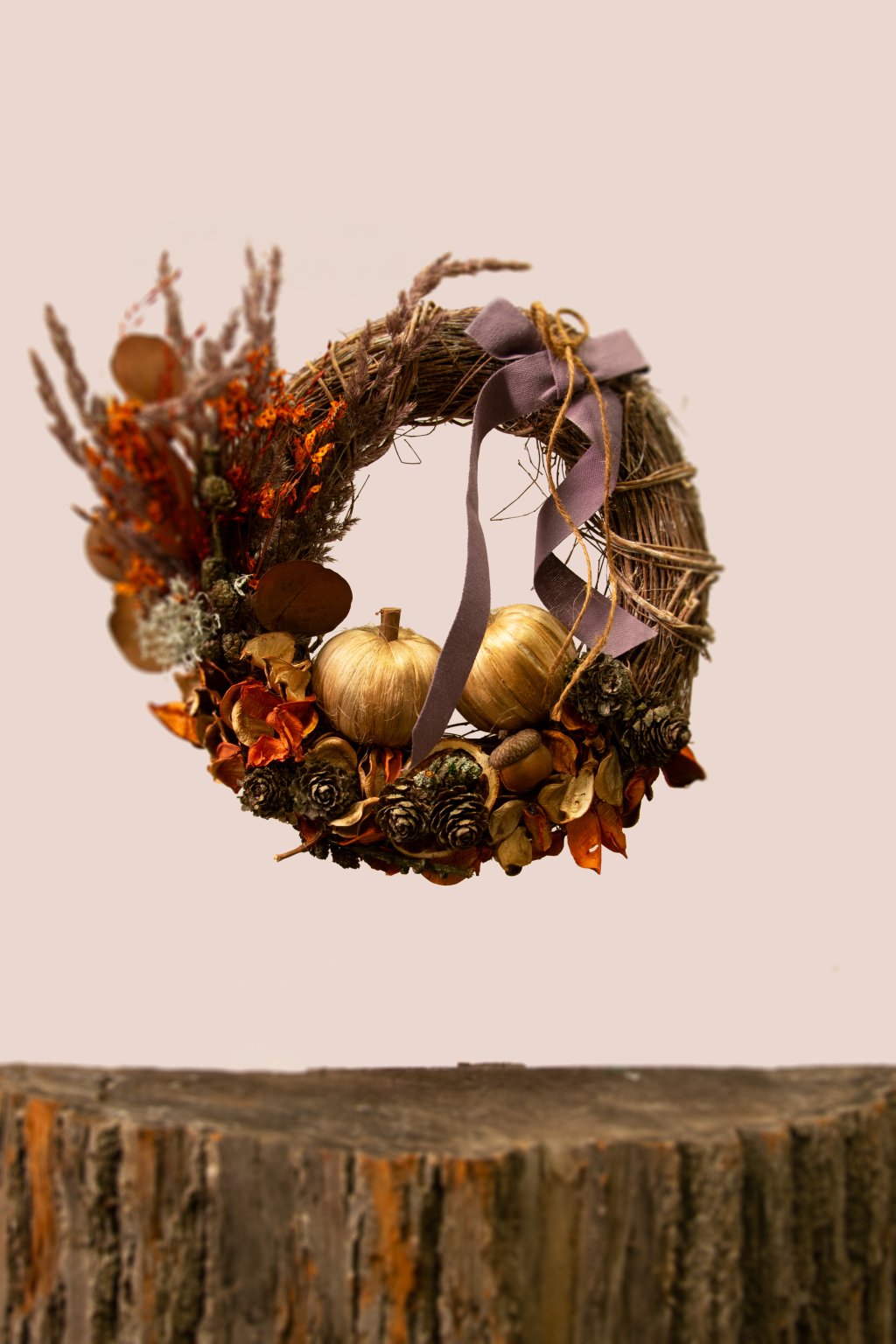- doplnený sušenými kvetmi, lístkami, šiškami a zlatými mini tekvičkami