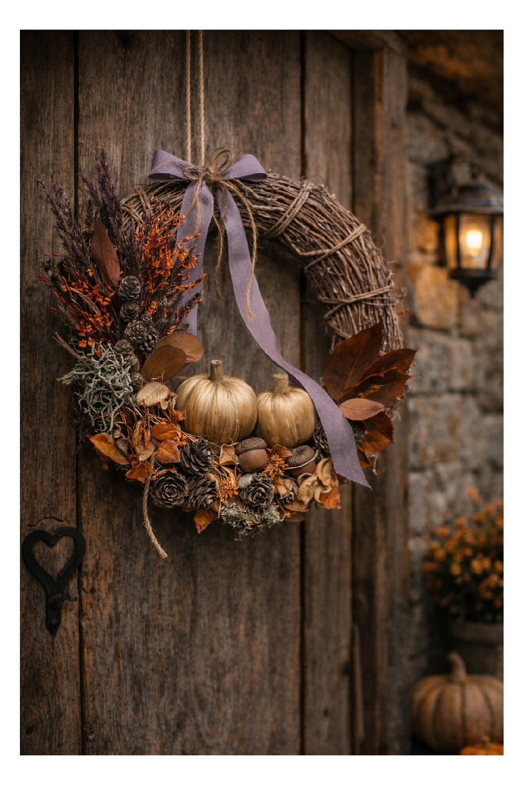 Jesenný veniec z prírodného prútia je ručne aranžovaný z teplých zemistých odtieňov, ktoré do interiéru prinesú útulnú atmosféru jesene. Spodnú časť zdobia sušené lístky, šišky, drobné plody a dekoratívne mini tekvičky , ktoré pôsobia elegantne a slávnostne. Vrchnú časť vence dopĺňajú steblá sušenej trávy a jemná fialová mašľa, vďaka ktorej dekorácia pôsobí romanticky a zároveň štýlovo.
