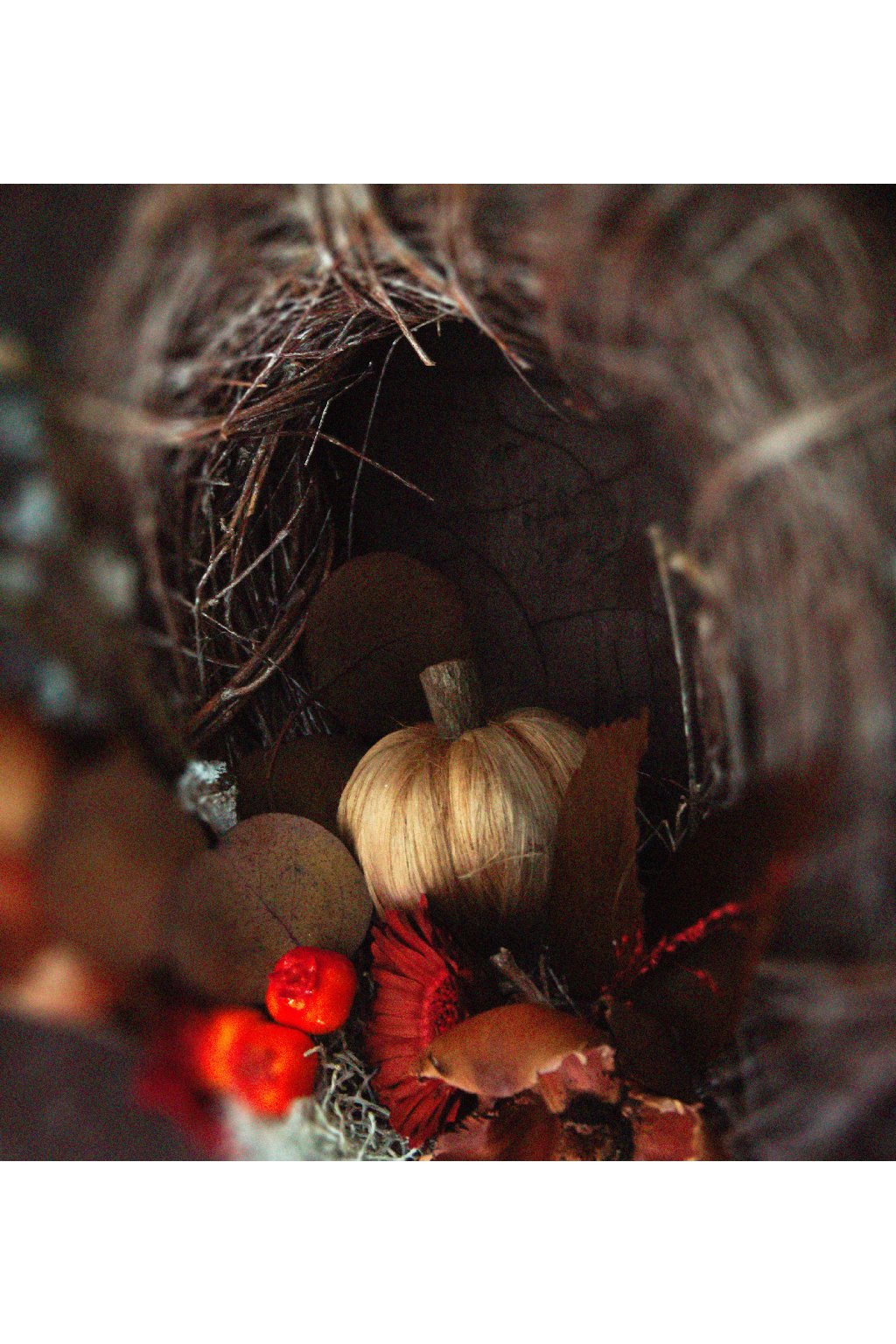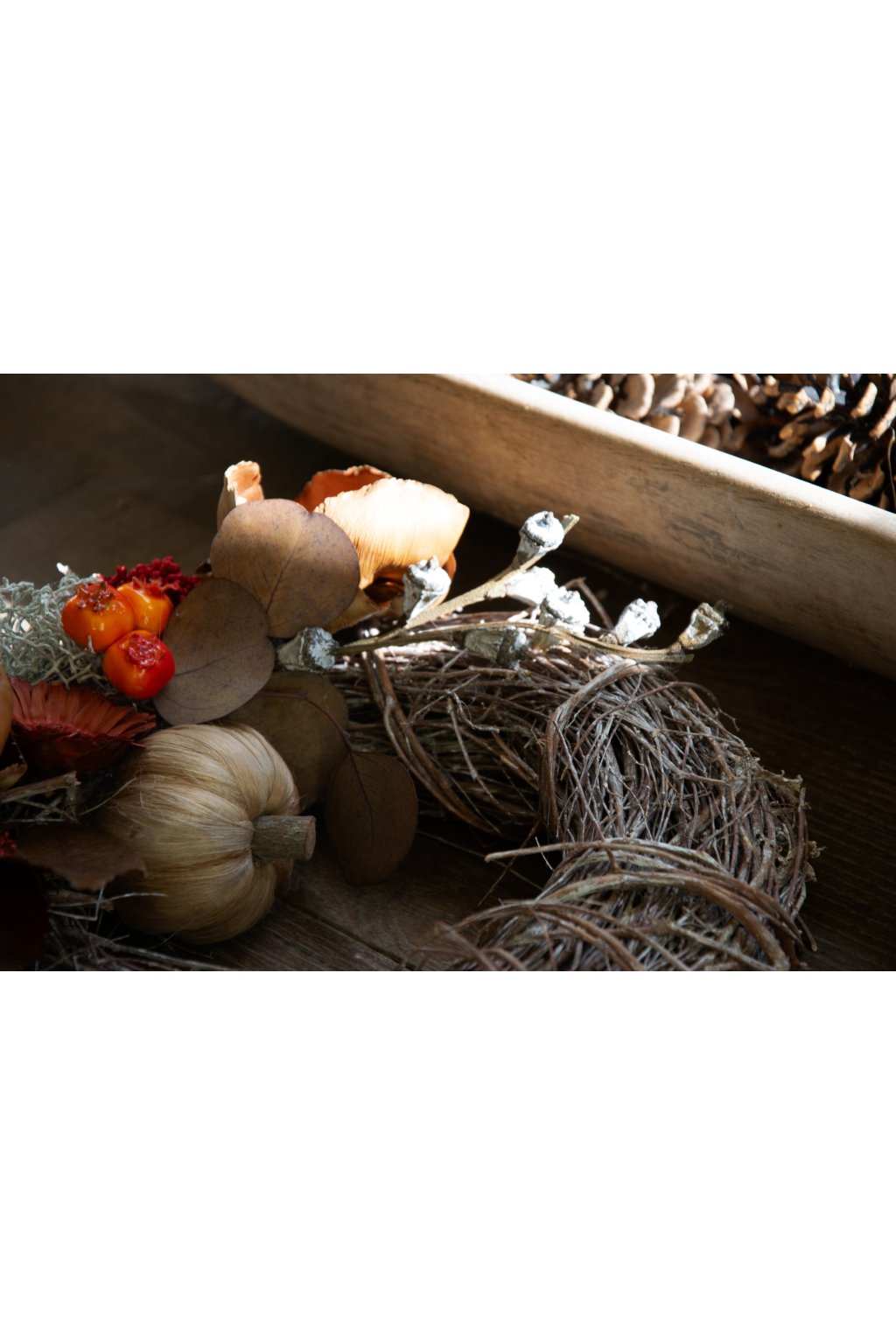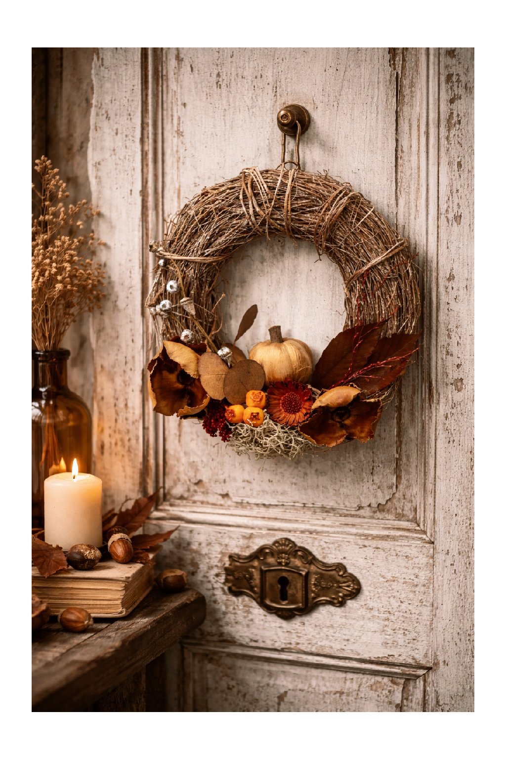 Rustikálny jesenný veniec z prirodzene prepleteného prútia pôsobí teplo a útulne. Dominantou je krémová mini tekvička, ktorú dopĺňajú sušené listy a plody, drobné bobuľky a porcia strieborného drôtika – všetko v hrejivých odtieňoch karamelu, medenej a tehlovej. Výzdoba je sústredená najmä v spodnej časti venca, takže pôsobí vzdušne a elegantne, no stále bohato textúrované.