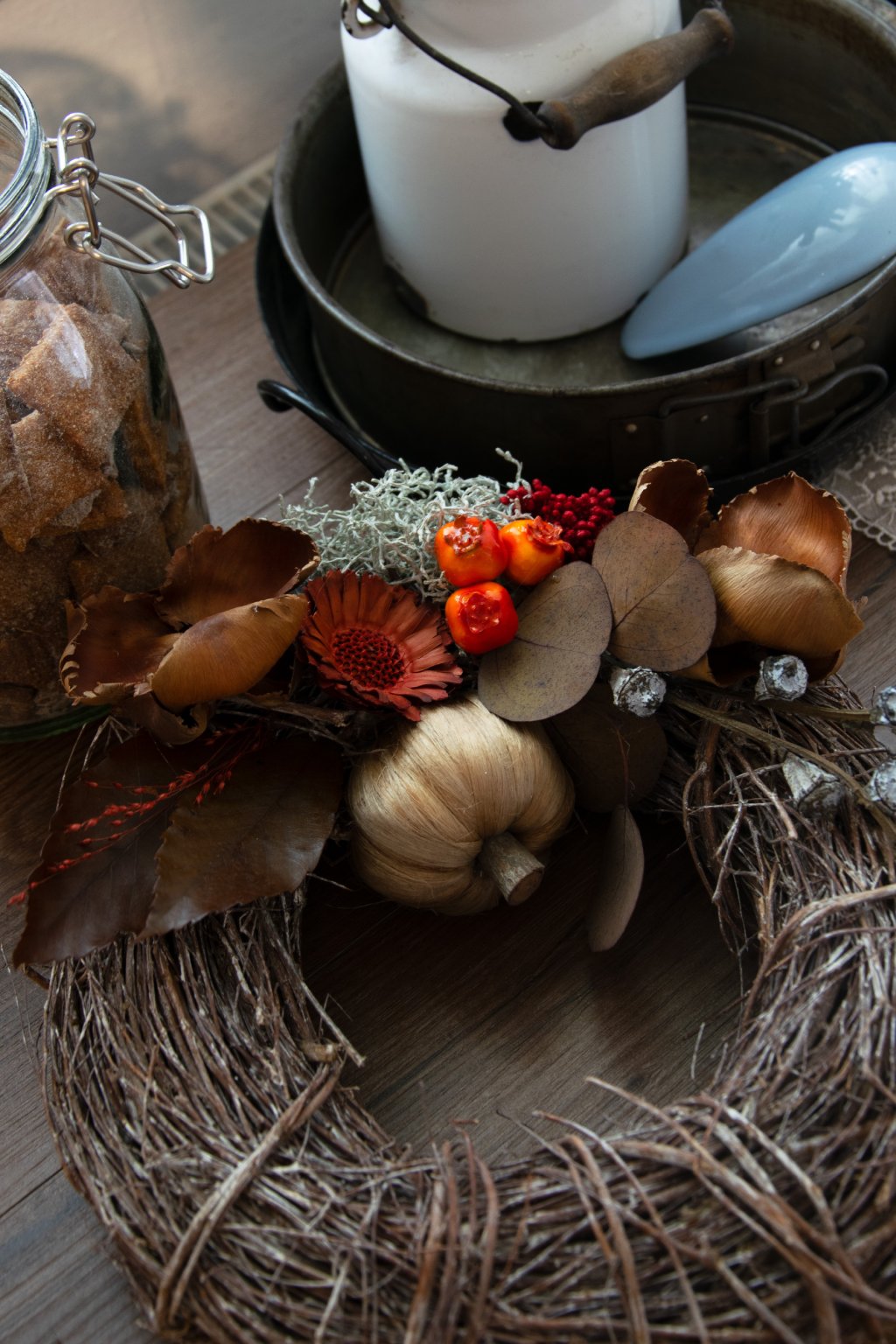 - sušené listy a plody, dekoratívne bobuľky, strieborný drôtik