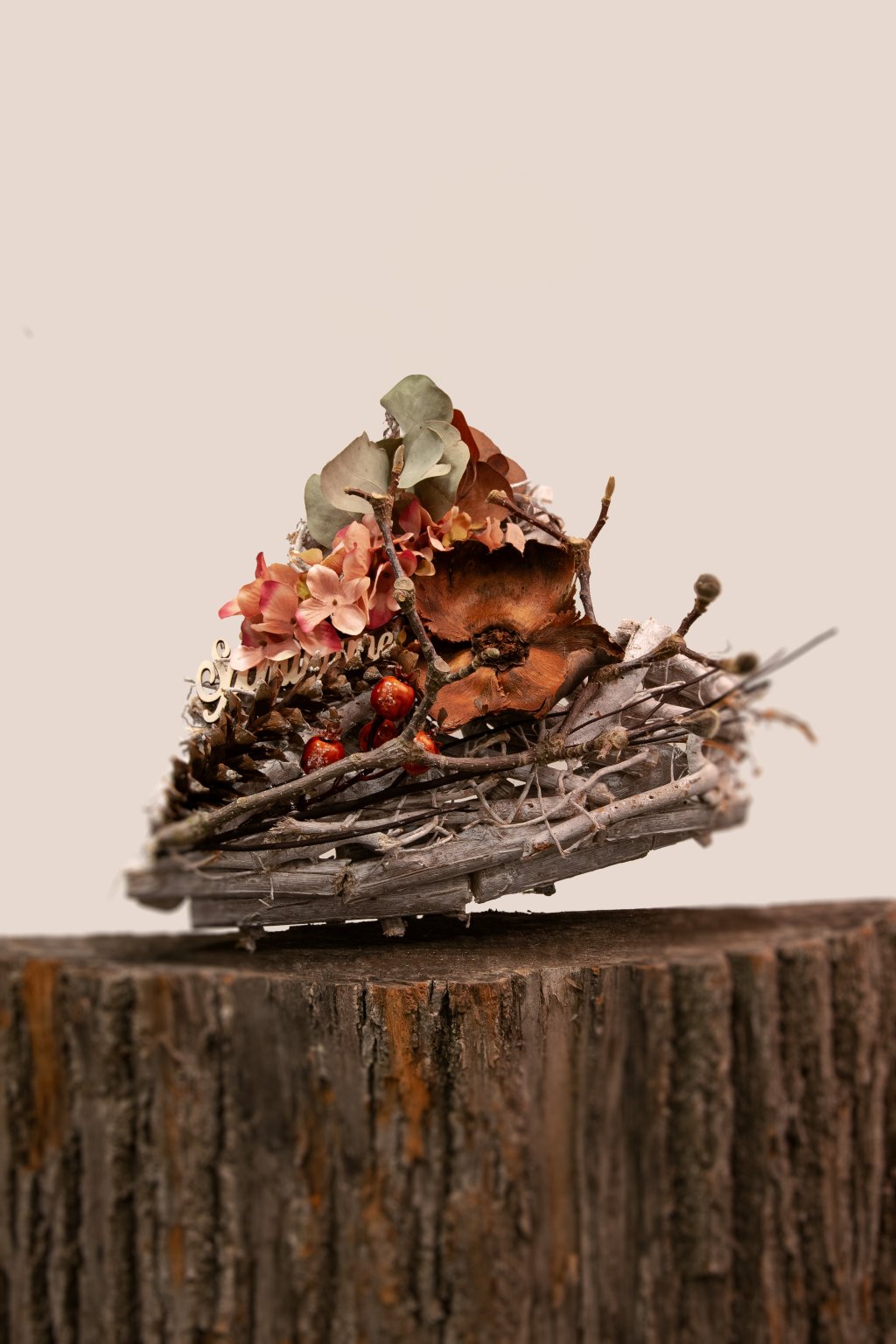 Smútočné prírodné srdce na hrob je ručne robená dekorácia vytvorená z prírodných materiálov. Základ tvorí pevná konštrukcia z konárikov a vetvičiek upravených do tvaru srdca, doplnená o sušené kvety, plody a listy v jemných prírodných odtieňoch. Kombinácia teplých hnedých tónov, staroružových kvetov a drobných červených plodov pôsobí decentne a dôstojne.