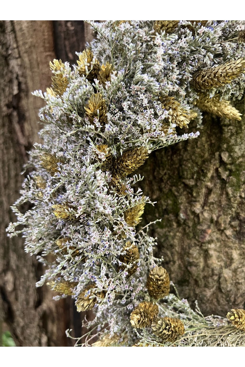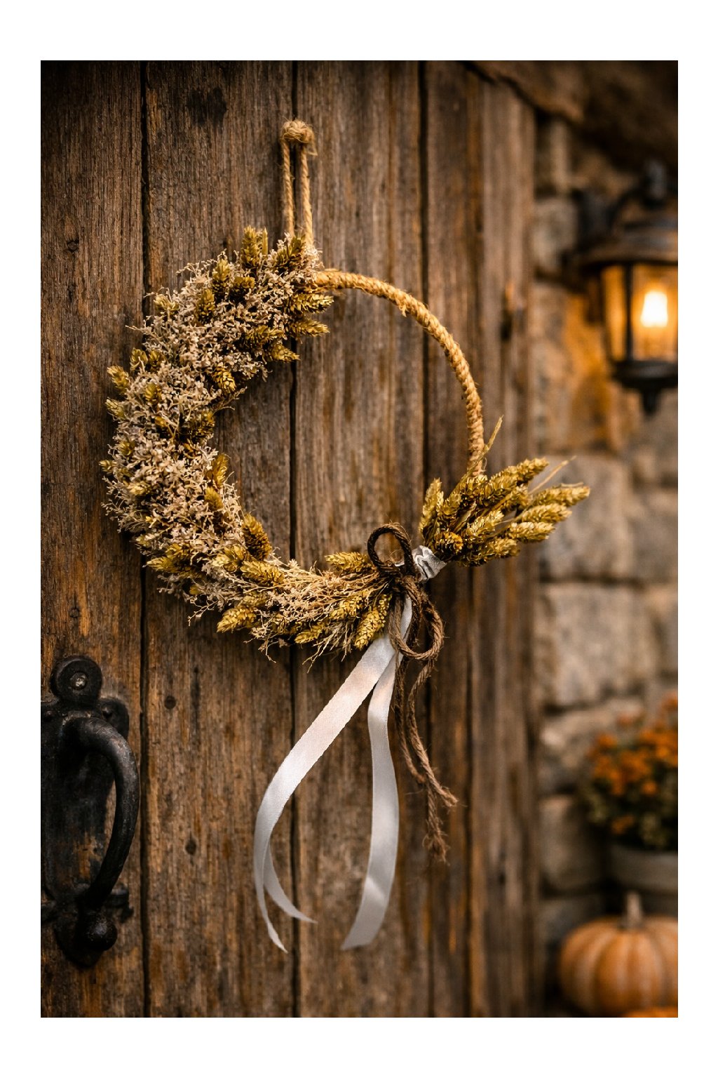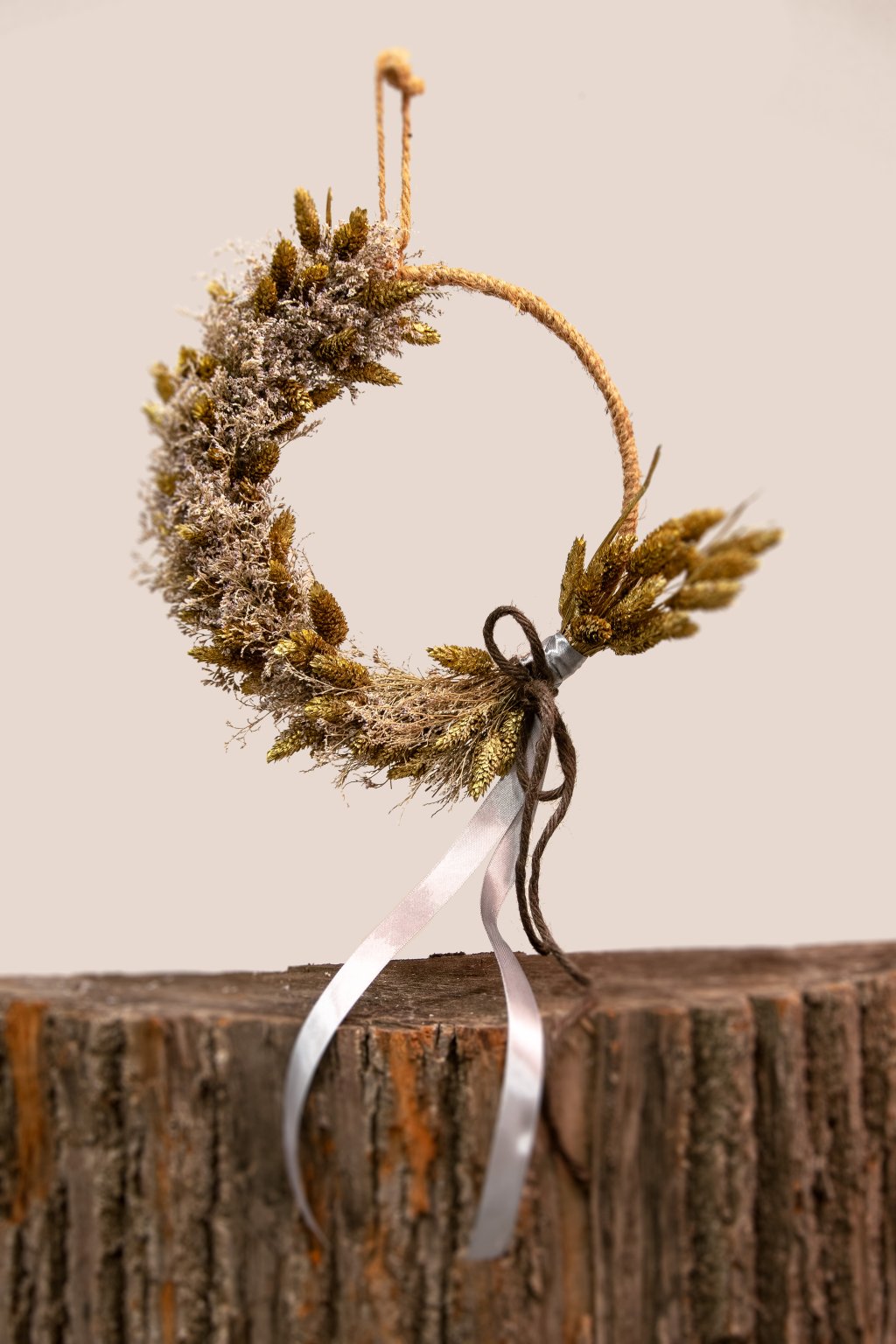 Ručne viazaný minimalistický polveniec na kovovom kruhu obalenom prírodnou jutou. Asymetrická výzdoba pokrýva približne dve tretiny kruhu a tvorí ju kombinácia zlatých klasov (napr. pšenica, phalaris) a sušeného limonia s jemným „námrazovým/zasneženým“ efektom. Dopĺňa ho biela saténová stuha a nenápadná jutová slučka na zavesenie. Výsledkom je ľahká, vzdušná dekorácia so severským nádychom.