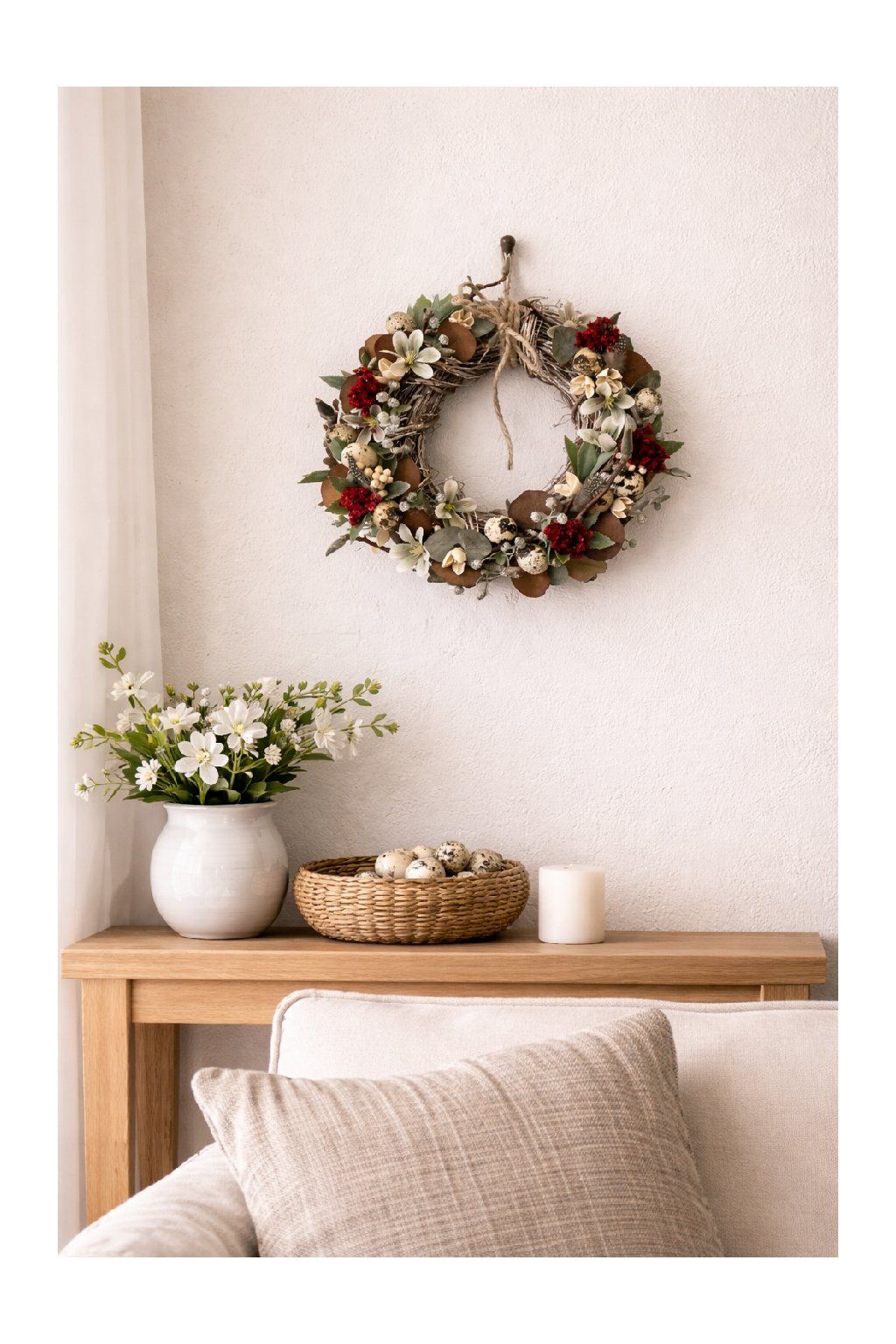 Tento jarný venček je vytvorený na prírodnom prútenom základe a bohato zdobený kvetmi stabilizovanej statice, listami hnedého eukalyptu, prepeličími vajíčkami a drobnými dekoratívnymi detailmi. Kombinácia prírodných materiálov, jemných krémových odtieňov, zelene a výraznejších červených akcentov pôsobí harmonicky, elegantne a zároveň sviežo.
