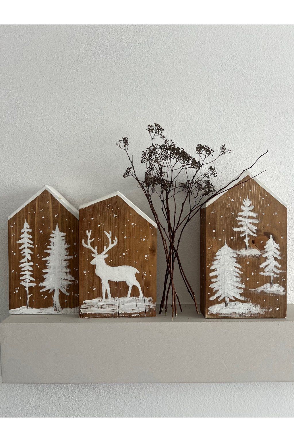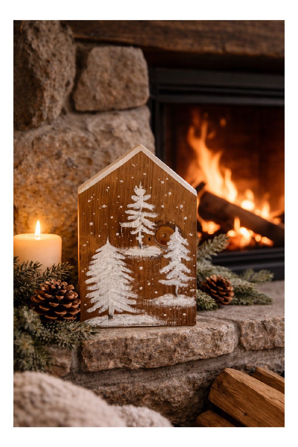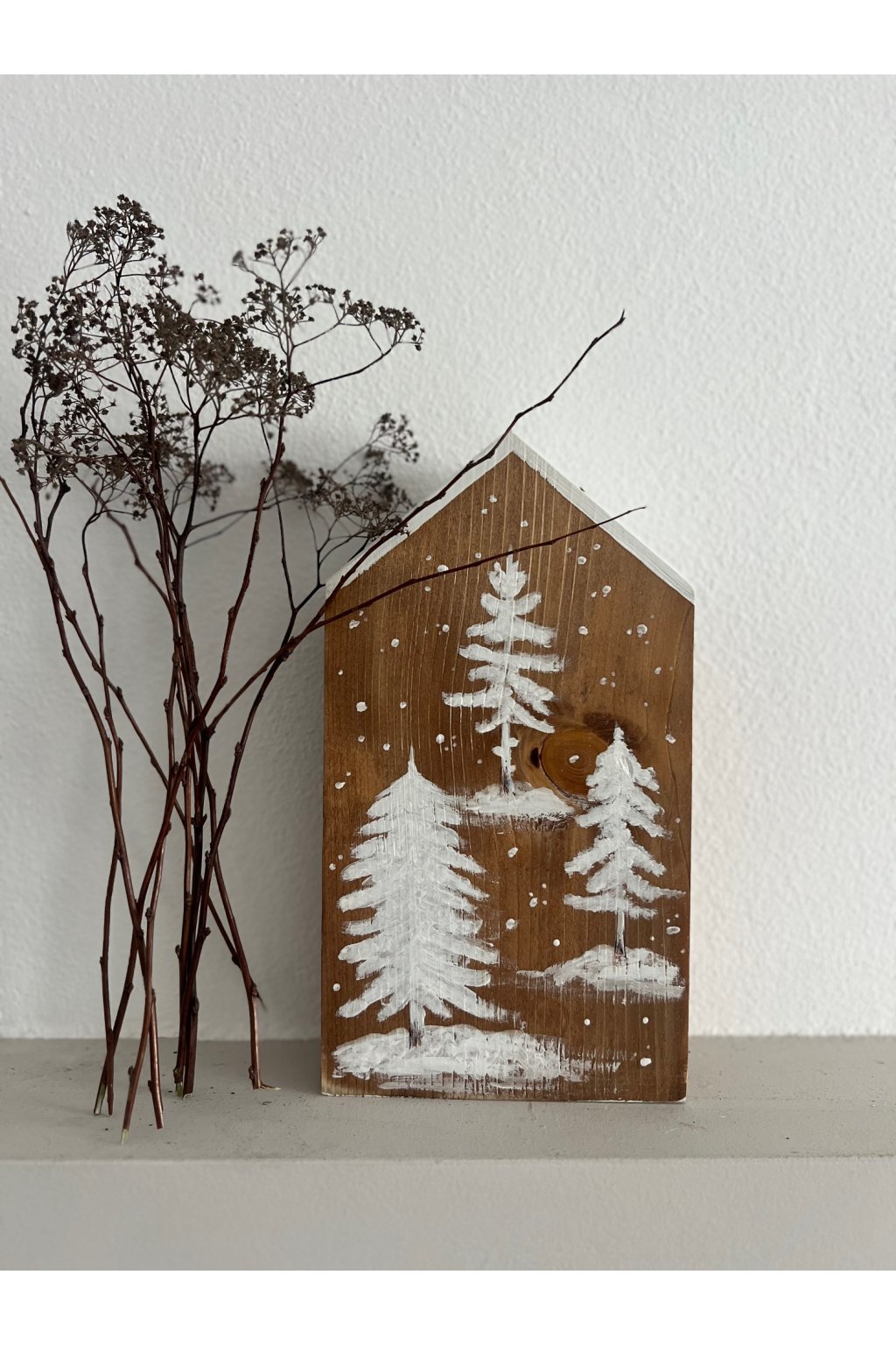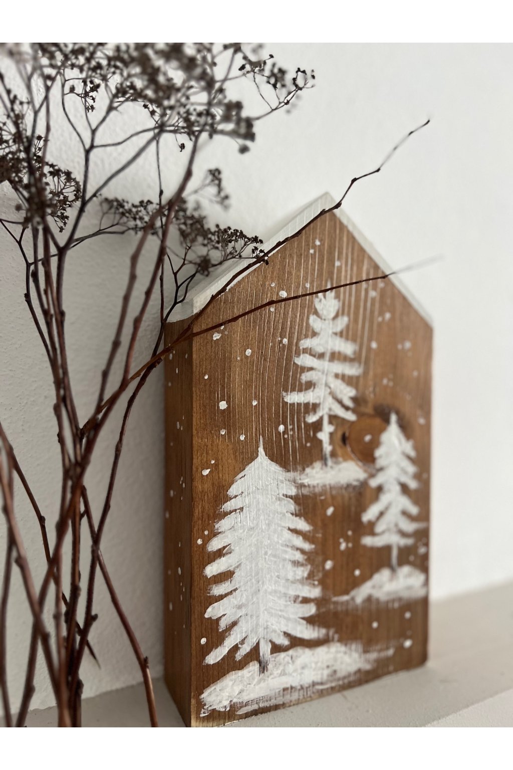 Drevený domček s ručne maľovaným zimným motívom zasnežených stromov je krásna, nadčasová dekorácia, ktorá zútulní interiér počas zimy aj Vianoc. Prírodná kresba dreva v kombinácii s bielymi detailmi pôsobí jemne a minimalisticky – domček vynikne samostatne, ale aj v aranžmáne so sviečkami, vetvičkami či ďalšími prírodnými doplnkami.