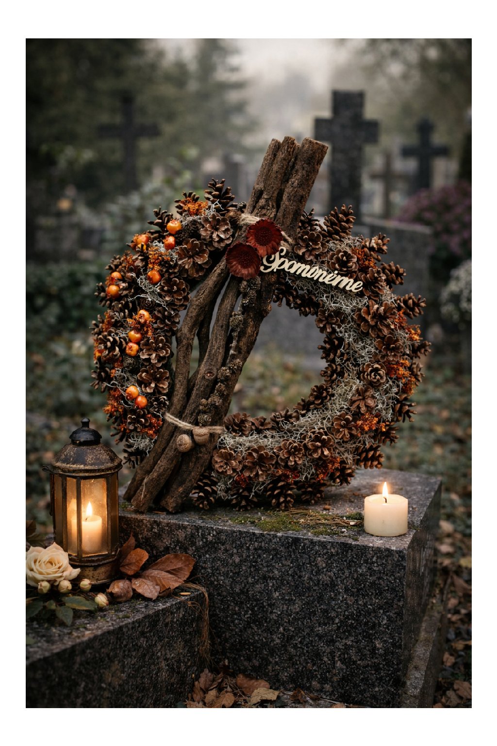 Ručne robený spomienkový veniec s prírodnou, lesnou estetikou. Kruhový základ je bohato obložený šiškami a stabilizovaným lišajníkom/machom, s akcentmi oranžových bobúľ. Prednú časť dotvára zväzok prírodných vetvičiek previazaný jutou a decentný drevený nápis „Spomíname“. Výrazná textúra a teplé tóny pôsobia dôstojne a pokojne.