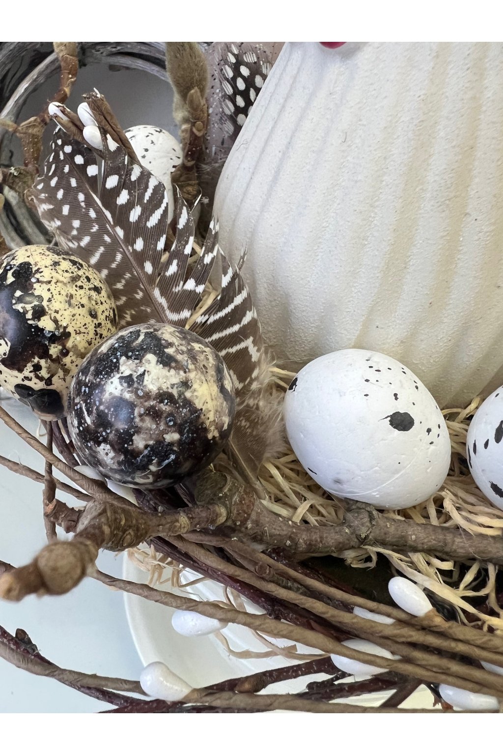 - prírodný vzhľad: hniezdo, vetvičky, pierka a vajíčka