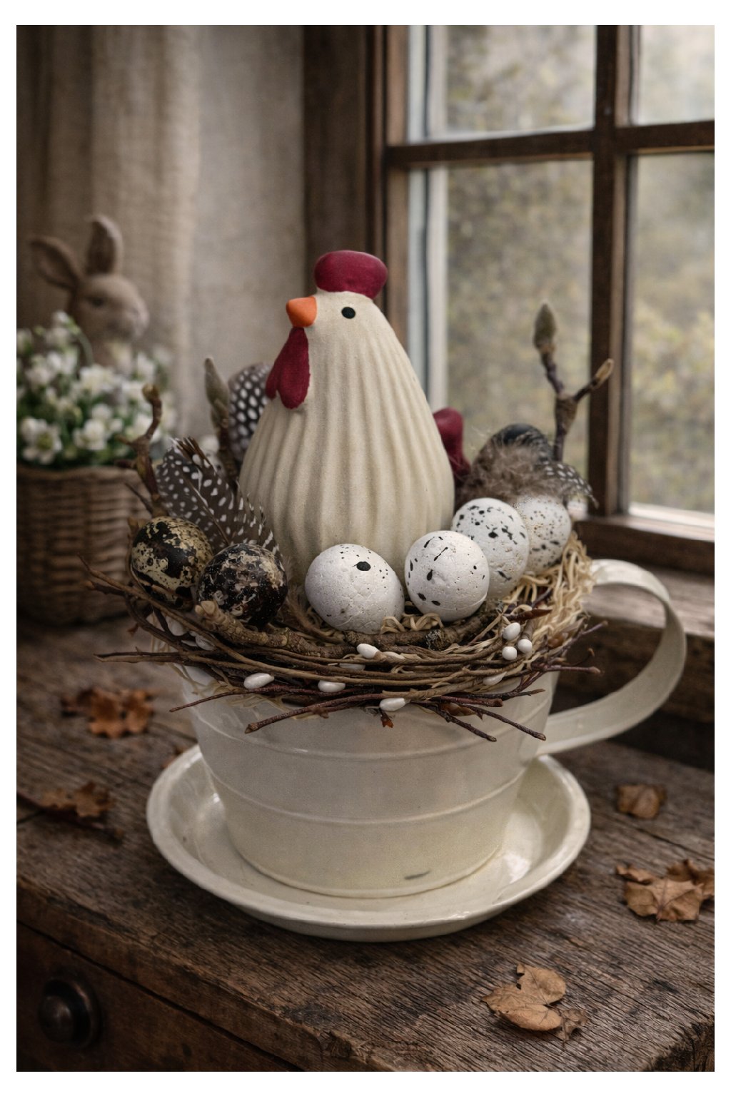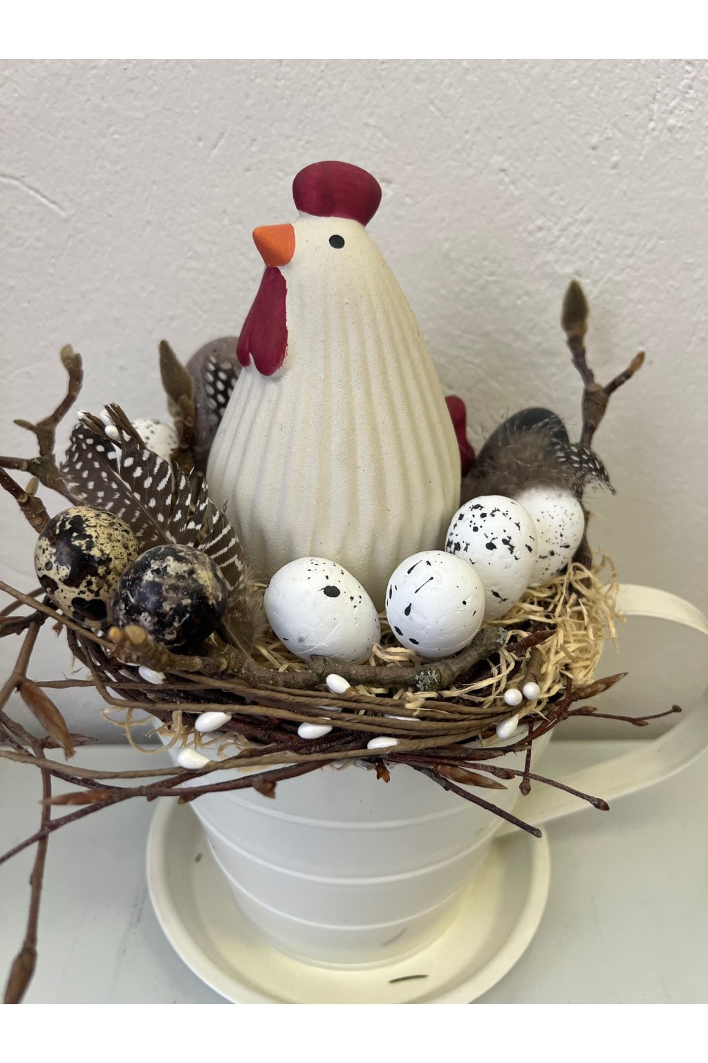 Tento nežný veľkonočný aranžmán so sliepočkou v hniezde prinesie do vášho domova pravú jarnú atmosféru. Dominantou dekorácie je sliepočka usadená v prírodnom hniezde, ktoré je bohato doplnené vajíčkami (vrátane prepeličích), pierkami a jemnými vetvičkami. Celok pôsobí prirodzene a zároveň sviatočne – ideálne na Veľkú noc aj ako jarná ozdoba, ktorú môžete nechať vystavenú počas celej sezóny.