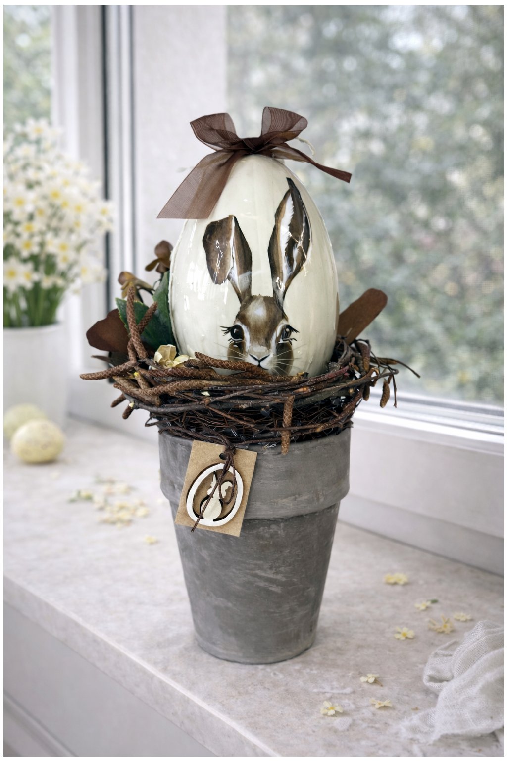Táto veľkonočná dekorácia prinesie do vášho domova jemnú jarnú atmosféru a prírodný šarm. Aranžmán je uložený v keramickom kvetináči v elegantnom sivom prevedení a doplnený prúteným hniezdom s prírodnými detailmi. Dominantou je plastové dekoratívne vajíčko s motívom zajačika a mašľou, ktoré pôsobí hravo aj vkusne zároveň.