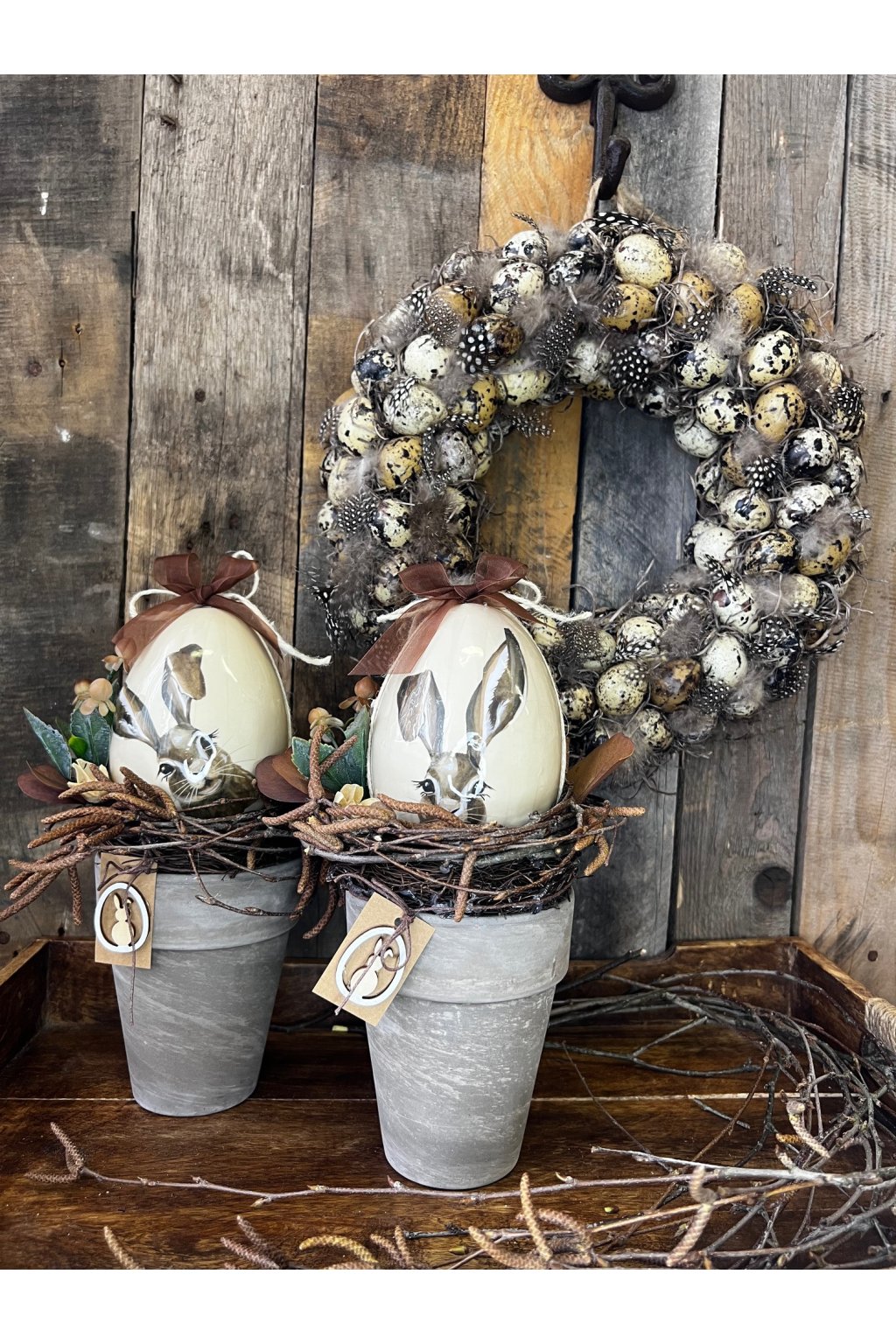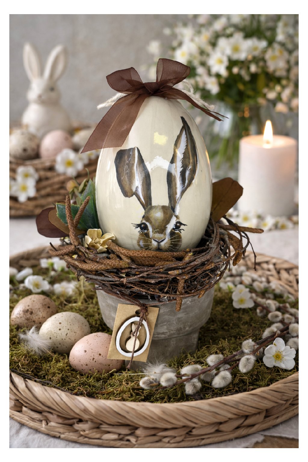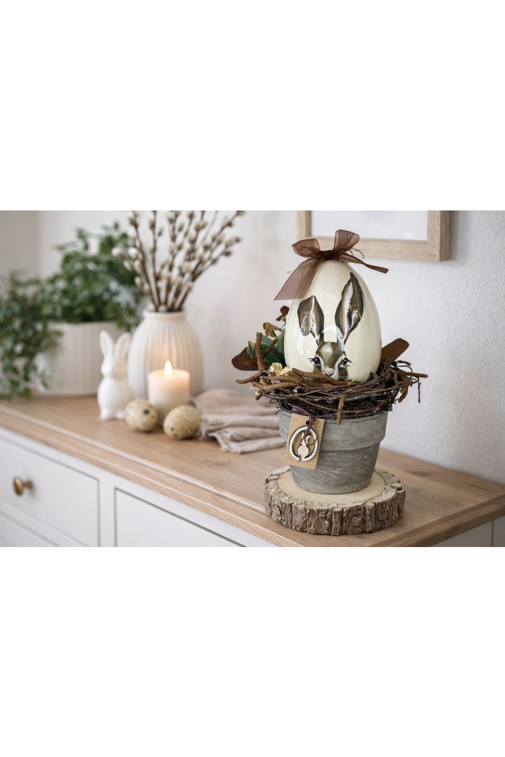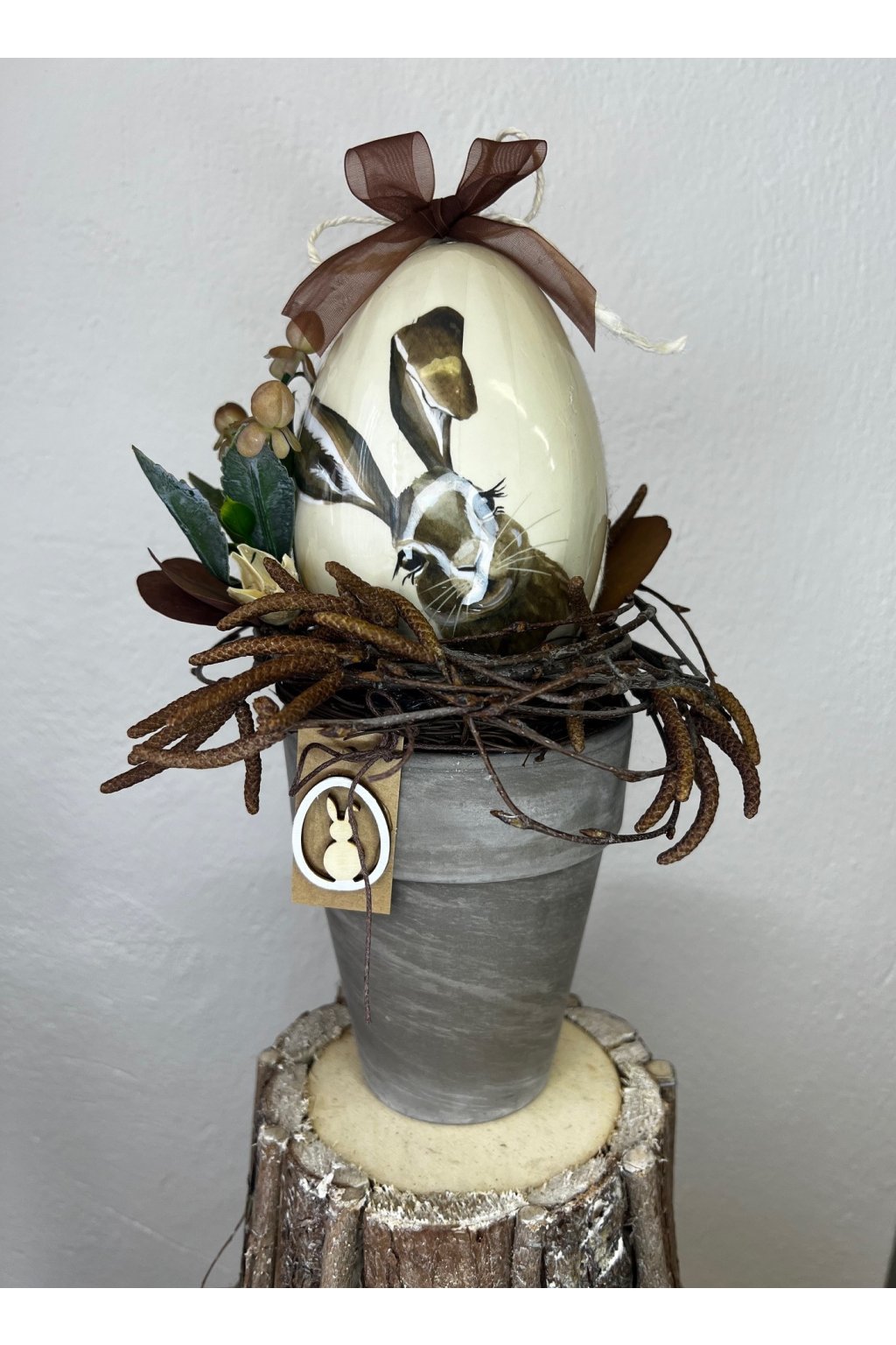 Táto veľkonočná dekorácia prinesie do vášho domova jemnú jarnú atmosféru a prírodný šarm. Aranžmán je uložený v keramickom kvetináči v elegantnom sivom prevedení a doplnený prúteným hniezdom s prírodnými detailmi. Dominantou je plastové dekoratívne vajíčko s motívom zajačika a mašľou, ktoré pôsobí hravo aj vkusne zároveň.