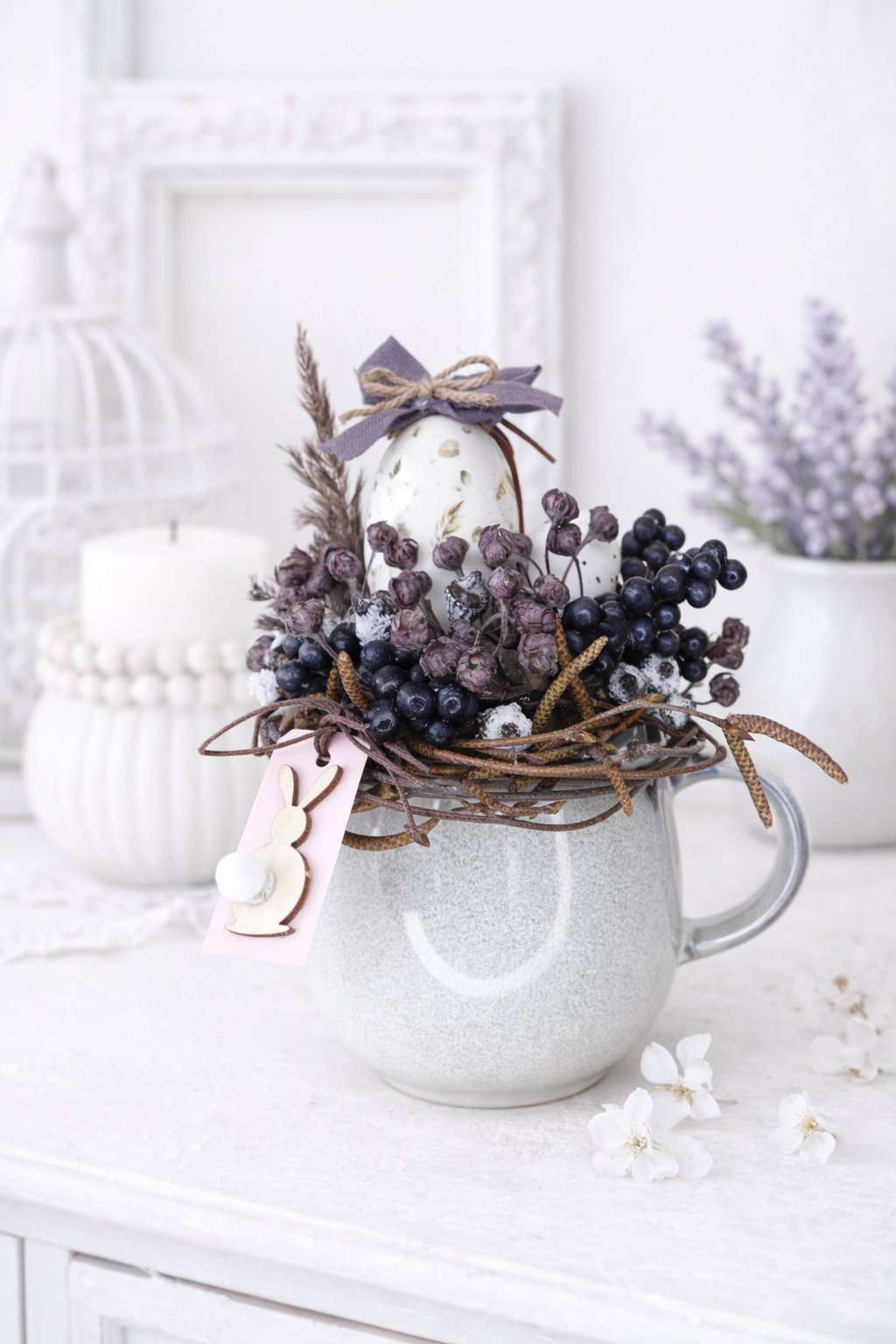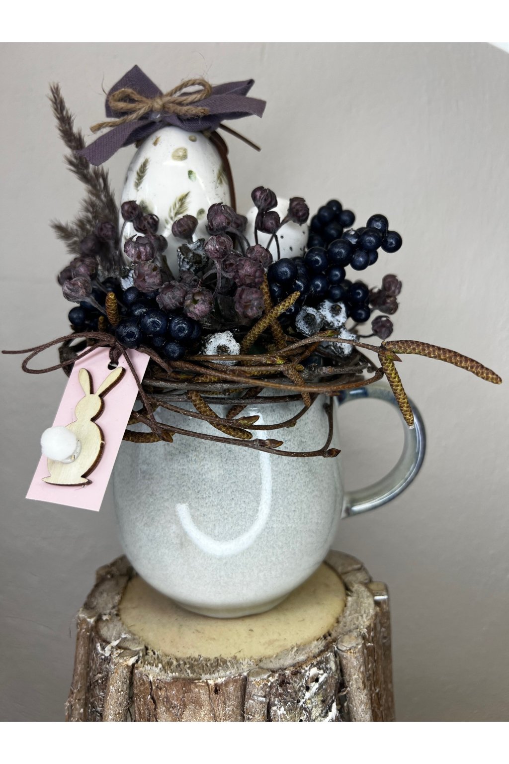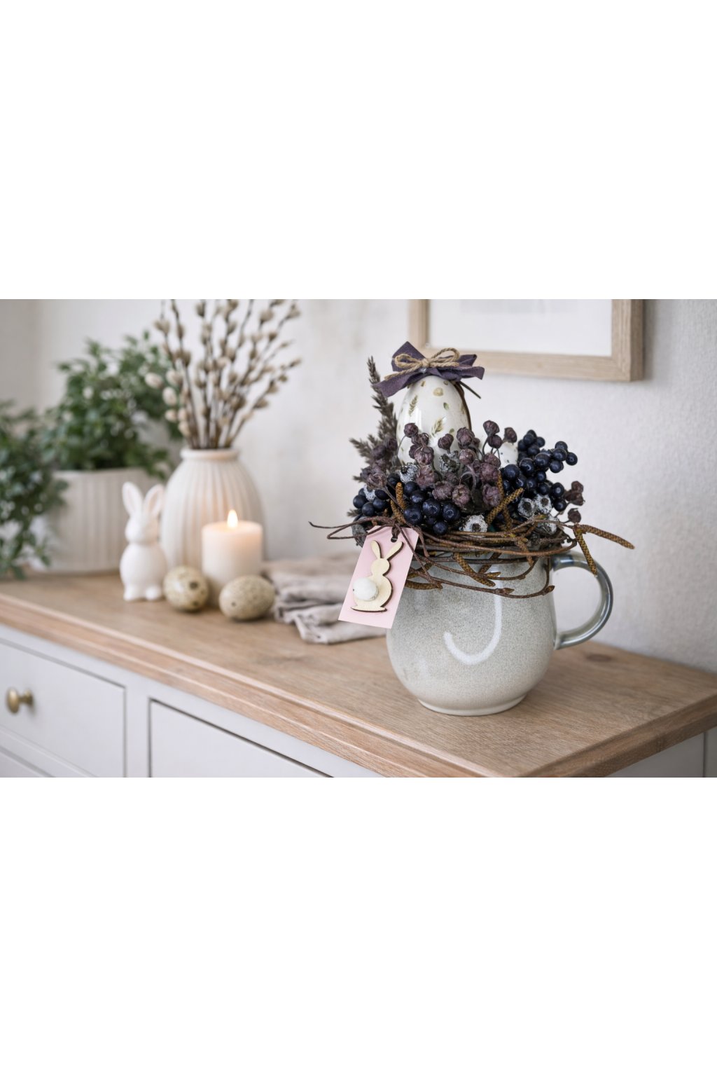 Keramický hrnček s veľkonočnou dekoráciou je krásnym jarným doplnkom, ktorý okamžite zútulní každý interiér. Aranžmán je vytvorený v jemných prírodných tónoch a doplnený elegantnými detailmi. Dominantou dekorácie je ozdobné veľkonočné vajíčko s jarnými motívmi, ktoré je doplnené brezovými vetvičkami a čiernymi umelými bobuľami. Celý vzhľad dotvára fialová mašľa a visačka, vďaka čomu pôsobí dekorácia darčekovo už na prvý pohľad.