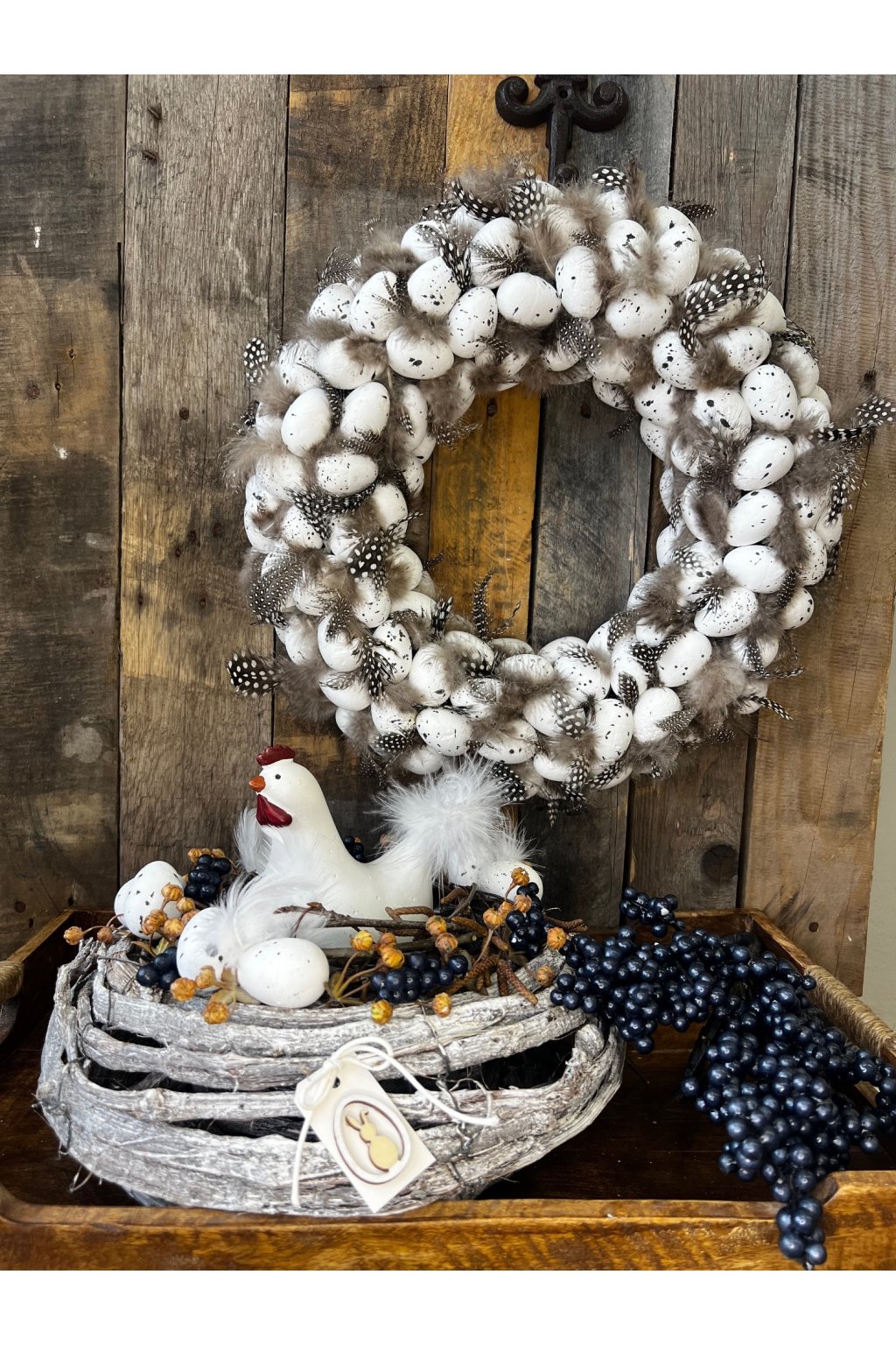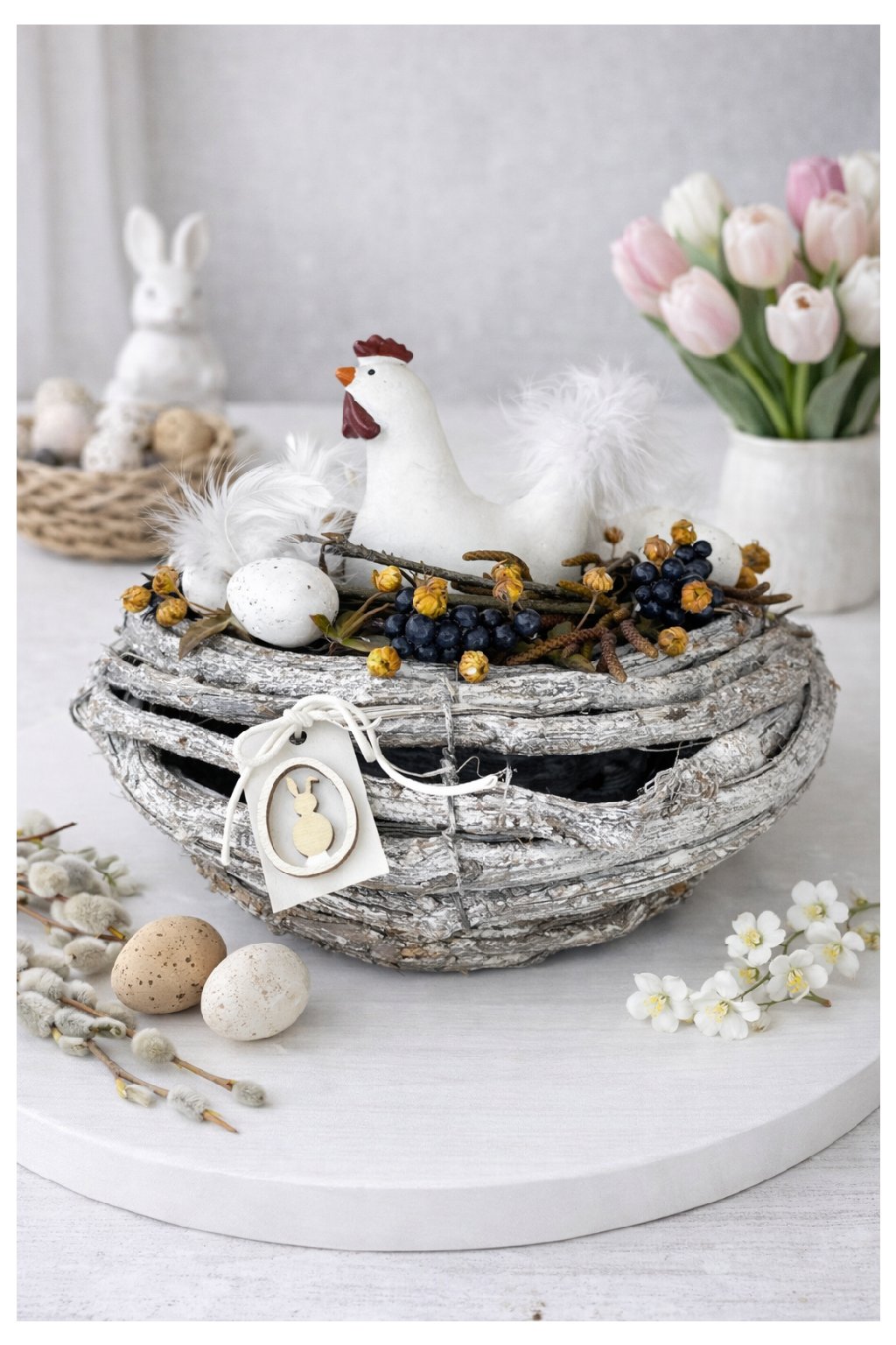 Toto veľkonočné hniezdo so sliepočkou je krásna jarná dekorácia, ktorá vnesie do interiéru útulnosť a sviatočnú atmosféru. Aranžmán je vytvorený v prútenom venci s prírodnými vetvičkami a doplnený o vajíčko, pierka a dekoratívne bobuľky. Dominantou je sliepočka, ktorá pôsobí mile a dodáva dekorácii tradičný veľkonočný charakter.