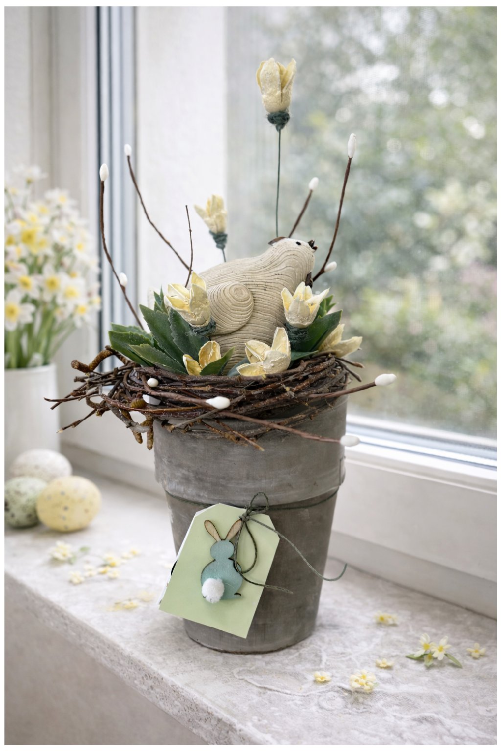 Prineste do svojho domova pokojný jarný nádych s týmto veľkonočným aranžmánom v kvetináči. Základ tvorí prírodný kvetináč doplnený hniezdom z prútikov, jarnou zeleňou a dekoratívnymi kvietkami. Dominantou je keramický vtáčik, ktorý pôsobí nežne a elegantne. Aranžmán dopĺňajú vetvičky s bahniatkami, ktoré mu dodávajú výšku a ľahkosť, a visačka so zajačikom ako milý veľkonočný detail.