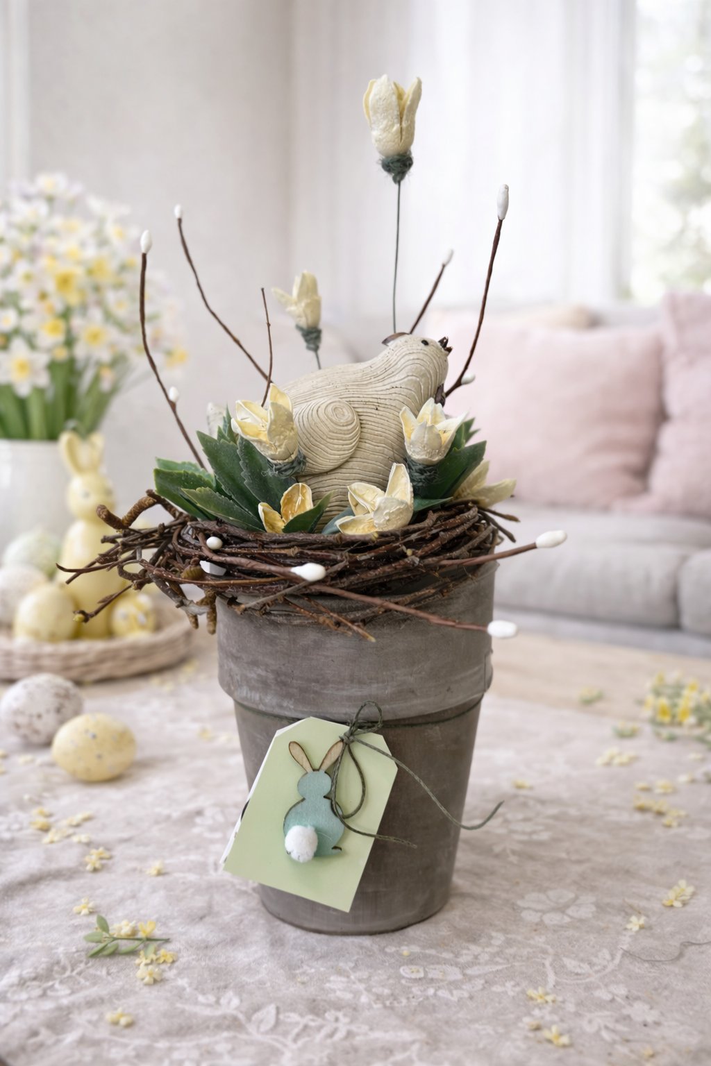 Veľkonočný aranžmán v kvetináči – vtáčik