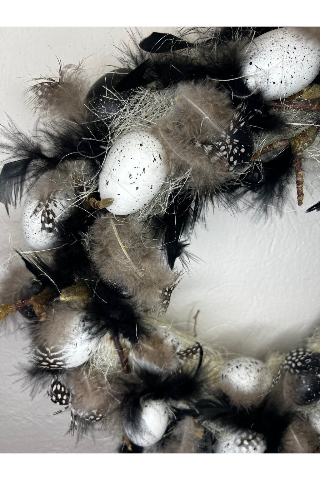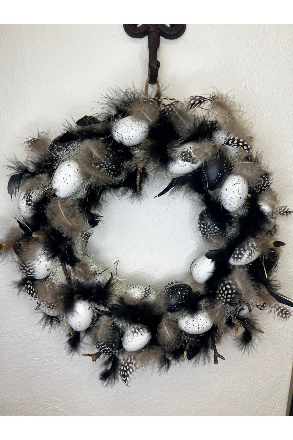 Ručne lepený veľkonočný venček v výraznej čierno-bielej kombinácii je ideálny pre milovníkov moderných a netradičných dekorácií. Základ tvorí bohaté aranžovanie z jemných tmavých pierok, ktoré venčeku dodávajú objem, ľahkosť a luxusný „dizajnový“ vzhľad. Kontrast dopĺňajú biele škvrnité vajíčka, vďaka ktorým venček pôsobí sviatočne, no zároveň elegantne a nadčasovo. Skvelo vynikne na svetlých dverách či stene a okamžite pritiahne pozornosť.