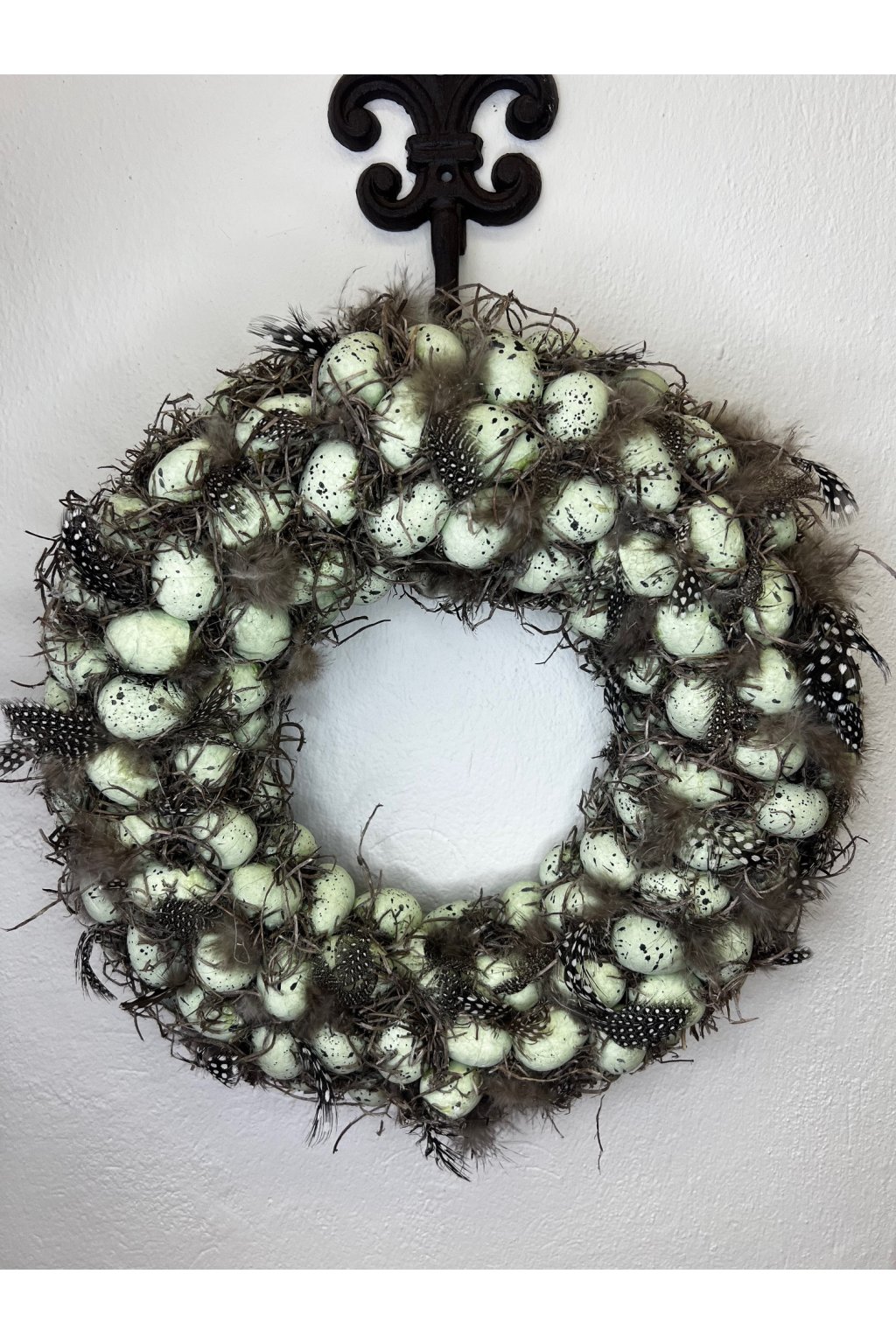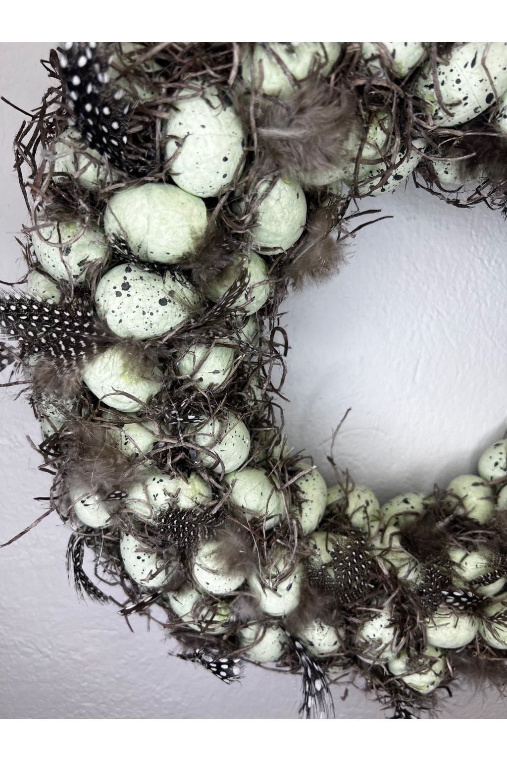 Ručne lepený jarný/veľkonočný venček v prírodnom, rustikálnom štýle je bohato zdobený vajíčkami so škvrnitým efektom, jemnými pierkami, ktoré spolu vytvárajú dojem malého „hniezda“. Neutrálne odtiene v kombinácii s jemnou zelenkastou farbou vajíčok pôsobia elegantne a ľahko sa kombinujú s akýmkoľvek interiérom.
