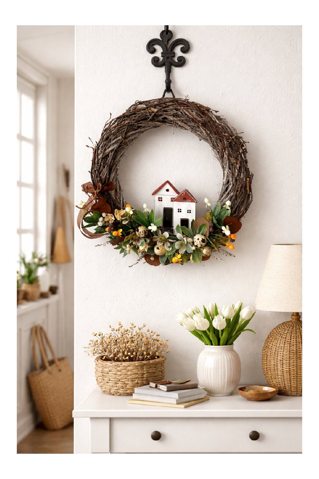Venček je navrhnutý tak, aby pôsobil prirodzene, elegantne a zároveň útulne. Hodí sa ako celoročná dekorácia, no krásne vynikne najmä na jar – na vchodových dverách, v predsieni, na stene či ako doplnok do vidieckeho aj moderného interiéru.