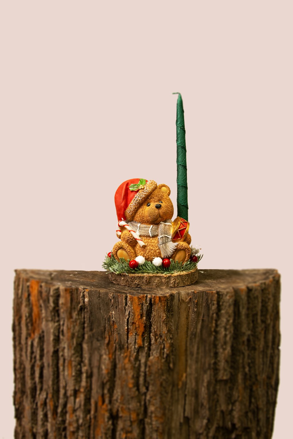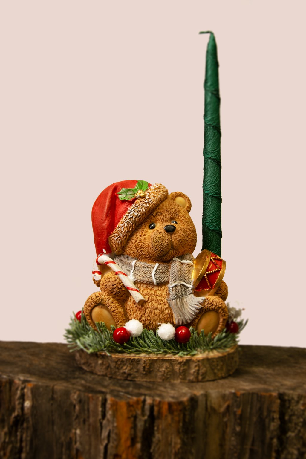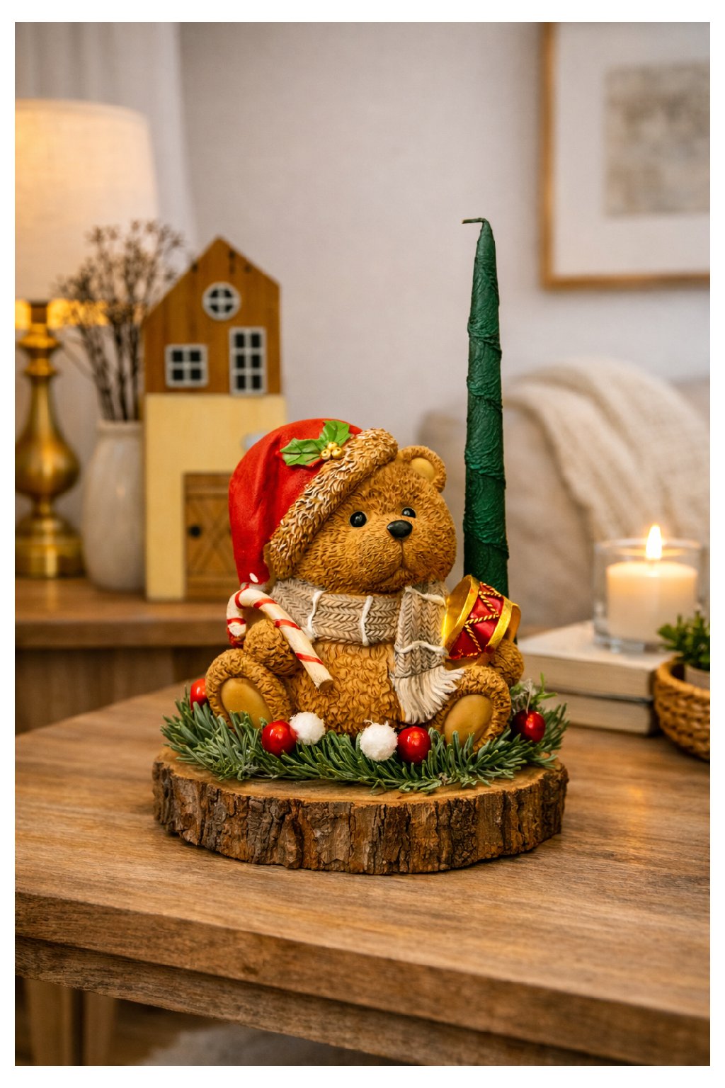 Táto milá vianočná dekorácia s medvedíkom v mikulášskej čiapke prinesie do interiéru hrejivú a rozprávkovú atmosféru. Medvedík sedí na drevenom podstavci, obklopený zeleným ihličím a červenými bobuľkami, v rukách drží lízankovú paličku a vedľa neho je malý bubienok – ako pripravený na vianočný koncert. Dekoráciu dopĺňa vysoká zelená sviečka, ktorá po zapálení vytvorí jemné, teplé svetlo a zvýrazní všetky detaily.
